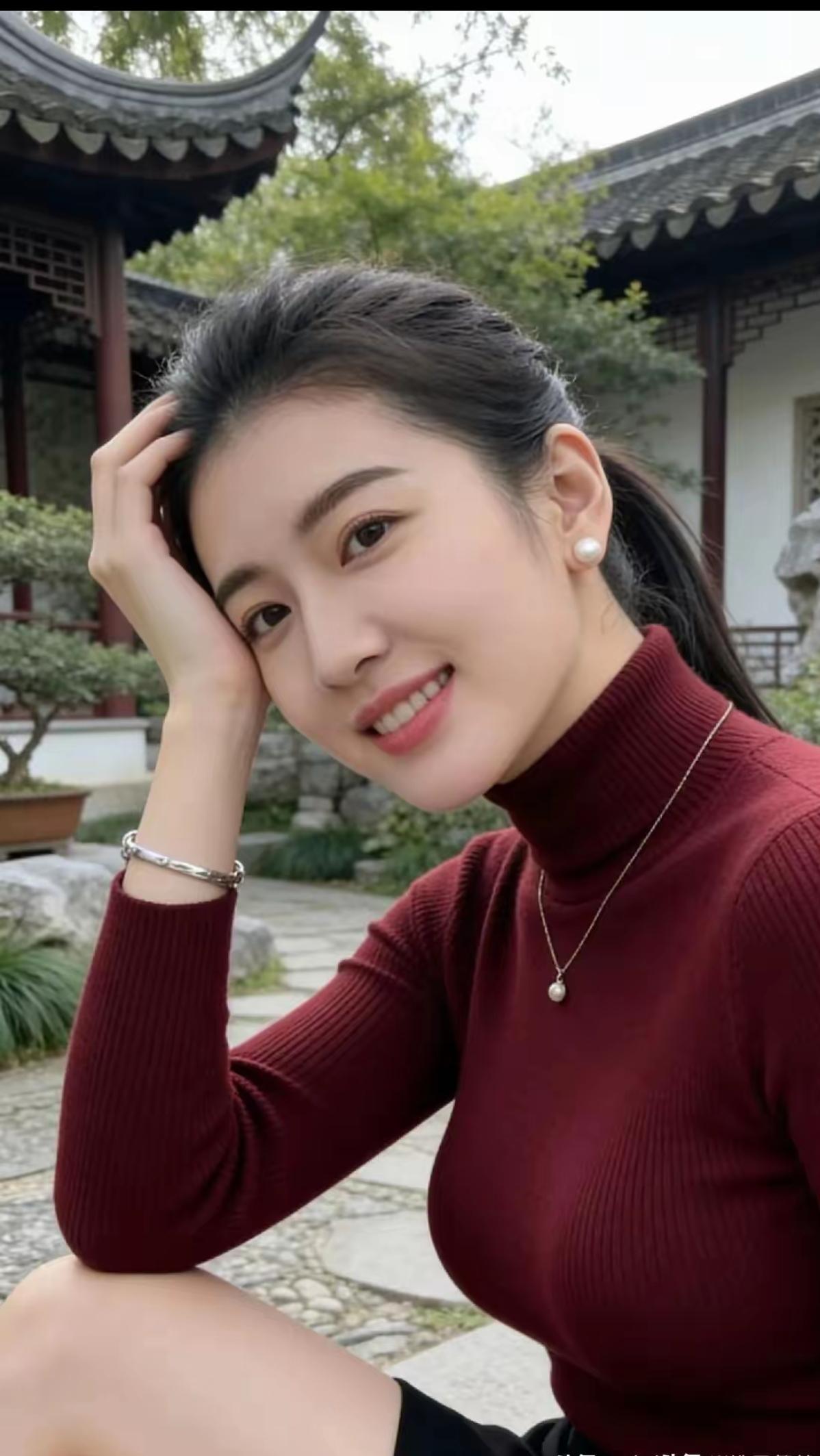 酒红色高领毛衣,搭配珍珠耳环,优雅又温暖。 玫红色毛衣穿搭 红色气质毛衣