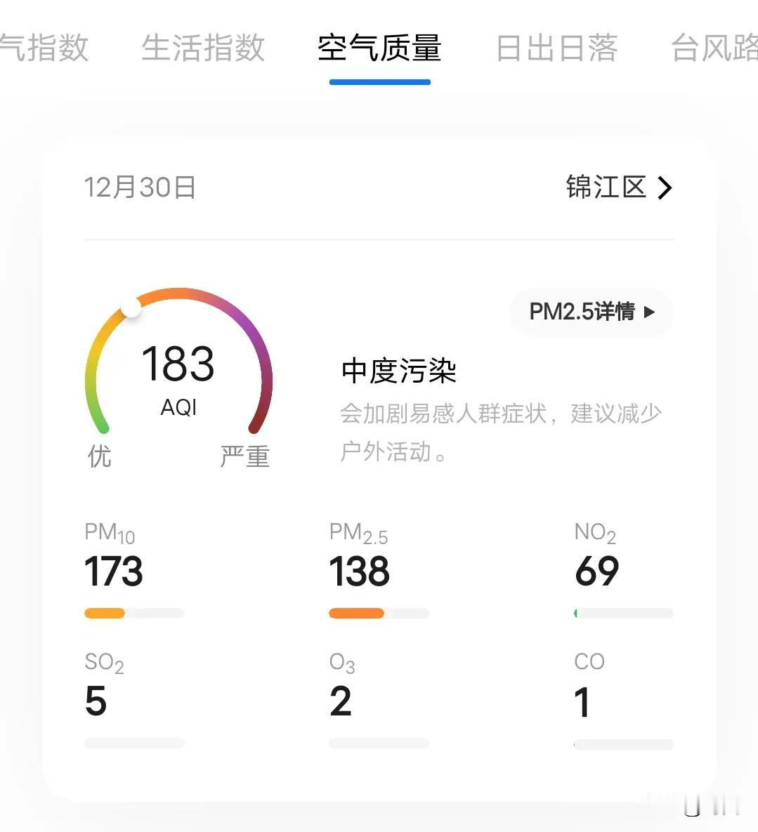 成都今天的雾霾遮天蔽日,4点过就像往日的傍晚,黄灰色的空气中夹杂着灰尘和雾气,官方空气指数183,看起来比北方的沙尘天气还差,楼下的太古里只能若隐若现,建议大家出门戴口罩,尽量在家不要外出,特别是老人和小孩等呼吸道抵抗力差的人群。 四川盆地地形加上成都平原气候,已经连续几周无风无雨的天气,让空气质量严重下降。希望今晚来一场小雨,缓解下,否则可能真要启动空气重度污染红色警报了,历史上还没有过红色预警,只有两次橙色预警。 大雾霾天气 成都天气 成都空气质量中度污染