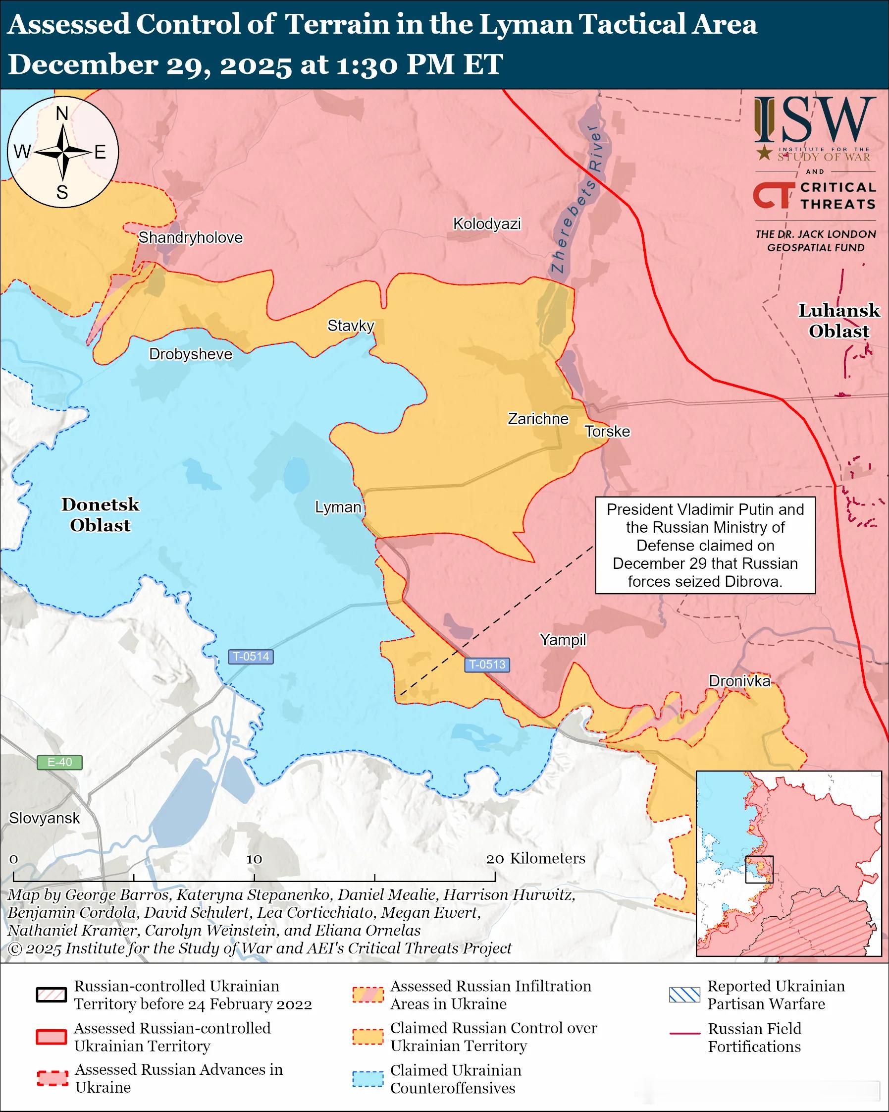 俄军主要行动2俄军目标:占领卢甘斯克州剩余部分,向西推进至哈尔科夫州东部,并包围顿涅茨克州北部。12月29日俄军继续向库皮扬斯克方向发起进攻,但并未取得进展。12月28日和29日俄军在库皮扬斯克附近发动进攻;向库皮扬斯克西北方向的马拉沙普基夫卡方向进攻;向库皮扬斯克东部的彼得罗巴甫洛夫卡方向进攻;向库皮扬斯克东南部的库里利夫卡附近及皮什恰内方向进攻;向库皮扬斯克南部的库皮扬斯克-武兹洛维附近及博尔德里夫卡和普里斯京方向进攻;以及向库皮扬斯克西南部的布拉霍达季夫卡方向进攻。俄方声称,乌克兰军队在库皮扬斯克及其周边地区,以及波多利(库皮扬斯克东部)和涅奇沃洛季夫卡(库皮扬斯克西部)附近进行了反击。乌克兰联合部队特遣部队发言人维克托·特列胡博夫上校于12月29日报告称,俄军已将库皮扬斯克方向的作战重点转移到奥斯基尔河东岸(左岸)的乌克兰阵地,包括库皮扬斯克-武兹洛维方向。特列胡博夫表示,由于天气原因,俄军在积雪覆盖的地形上行动更加显眼,但如果奥斯基尔河结冰,俄军步兵可能徒步渡河。特列胡博夫还表示,乌克兰军队正在库皮扬斯克方向部署大量无人机,如果天气条件允许无人机飞行,俄军步兵试图渡过冰封的奥斯基尔河将很容易遭到乌克兰无人机的打击。一位俄罗斯军事博主声称,俄罗斯和乌克兰军队各自控制着库皮扬斯克的不同区域,而该镇的其余部分则是一个有争议的“灰色地带”。另一位俄罗斯军事博主声称,乌克兰军队包围了库皮扬斯克的三个区域,并在那里埋设了地雷,一些俄军小股部队在那里保留了阵地。据称与俄北方集团军有关联的军事博主于 12 月 29 日声称,驻扎在德沃里昌斯克(库皮扬斯克东北部)附近的俄第 79 摩步团(第 18 摩步师,第 11 军,列宁格勒军区)指挥部将完全由伤残、残疾和患病人员组成的排派往前线。该军事博主声称,该团在 2025 年 12 月遭受了约 200 人伤亡,其中 140 人死于非战斗医疗问题。作战序列:据报道俄第 352 摩步团(第 11 集团军)和第 121 摩步团(第 68 摩步师,第 6 集团军,LMD)继续在库皮扬斯克方向作战。12月29日俄军继续在博罗瓦发动进攻,但并未取得确切进展。未经证实的说法:俄罗斯军事博客作者声称,俄军在赫雷基夫卡(博罗瓦东南)附近和该定居点以西推进。12月28日和29日,俄军在博罗瓦东南方向的赫雷基夫卡附近以及德鲁热柳比夫卡方向发动进攻。12月29日俄军继续在斯拉维扬斯克-利曼方向发动进攻,但并未取得确切进展。未经证实的说法:俄罗斯军事博客作者声称,俄军在莱曼附近以及科罗维亚尔(莱曼西北部)附近推进。12月28日和29日俄军在莱曼附近及莱曼境内发动进攻;在莱曼西北部的新谢利夫卡、奥列克桑德里夫卡、科罗维亚尔和德罗比舍韦附近;在莱曼北部的新米哈伊利夫卡和斯塔夫基附近;在莱曼东北部的米尔内附近;以及在莱曼东部的扎里奇内附近发动进攻。俄罗斯军事博客声称,乌克兰军队在德罗比舍韦和斯塔夫基附近进行了反击。