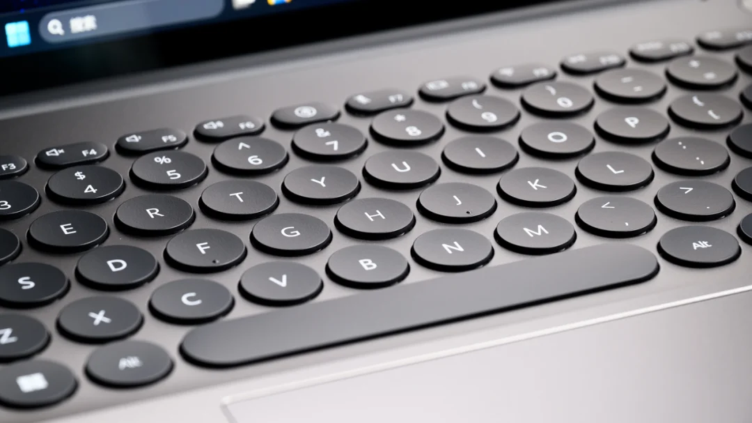最后是C面,它是整台电脑设计最独特的地方,圆形键帽设计,即便是完全不懂电脑的小白,也能看出它和其他笔电不一样,这个设计非常大胆、出挑,让我能隔开十米认出它来。[笑哭R]