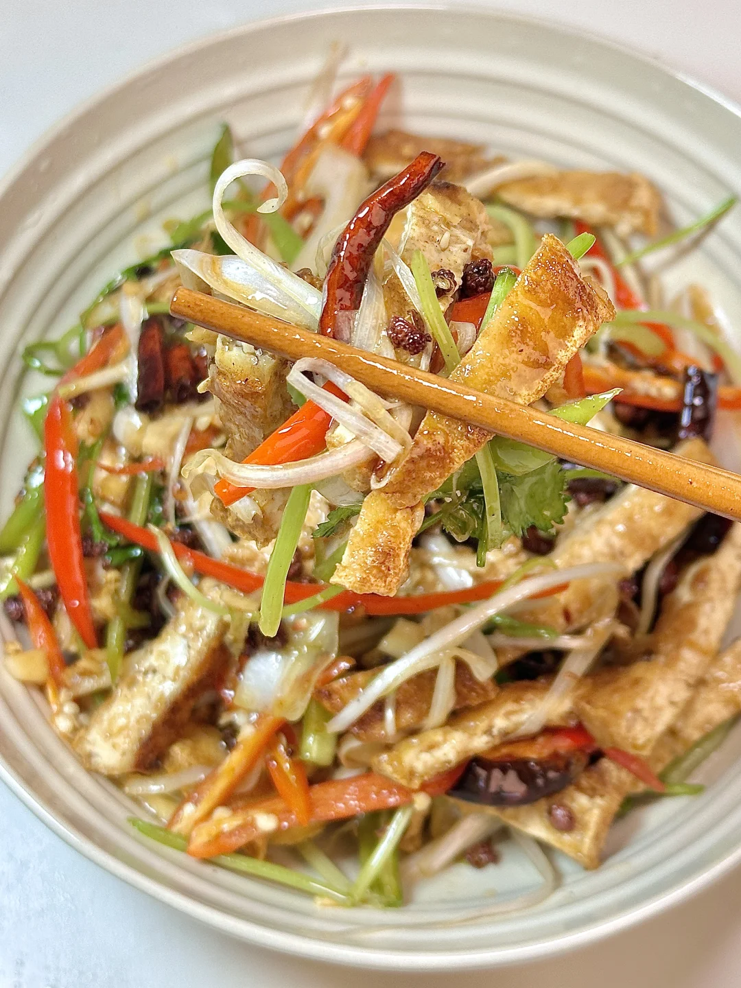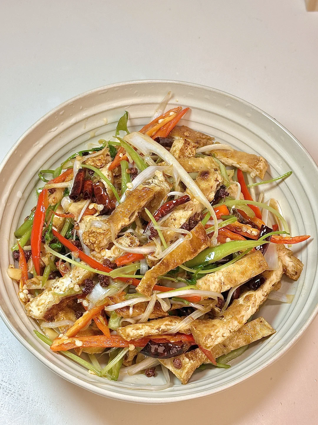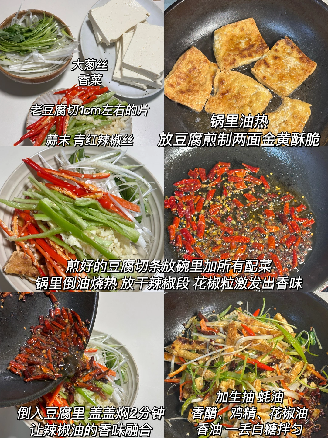 凉拌炸豆腐丝 外酥里嫩搭配解腻的大葱丝真好吃😋 ✨食材:老豆腐一块 蒜末 小米椒 青椒 香菜 大葱 1️⃣:锅里油热,放入豆腐煎至两面金黄酥脆,煎好后切条放入碗中,加入所有配菜。锅里油重新烧热,放入干辣椒段、花椒粒炒出香味。 2️⃣:将辣椒油倒入装豆腐的碗中,盖盖焖2分钟,调味加加入生抽、蚝油、香醋、鸡精、花椒油、香油和少许白糖,拌匀。 好好吃饭呀🖖🏻