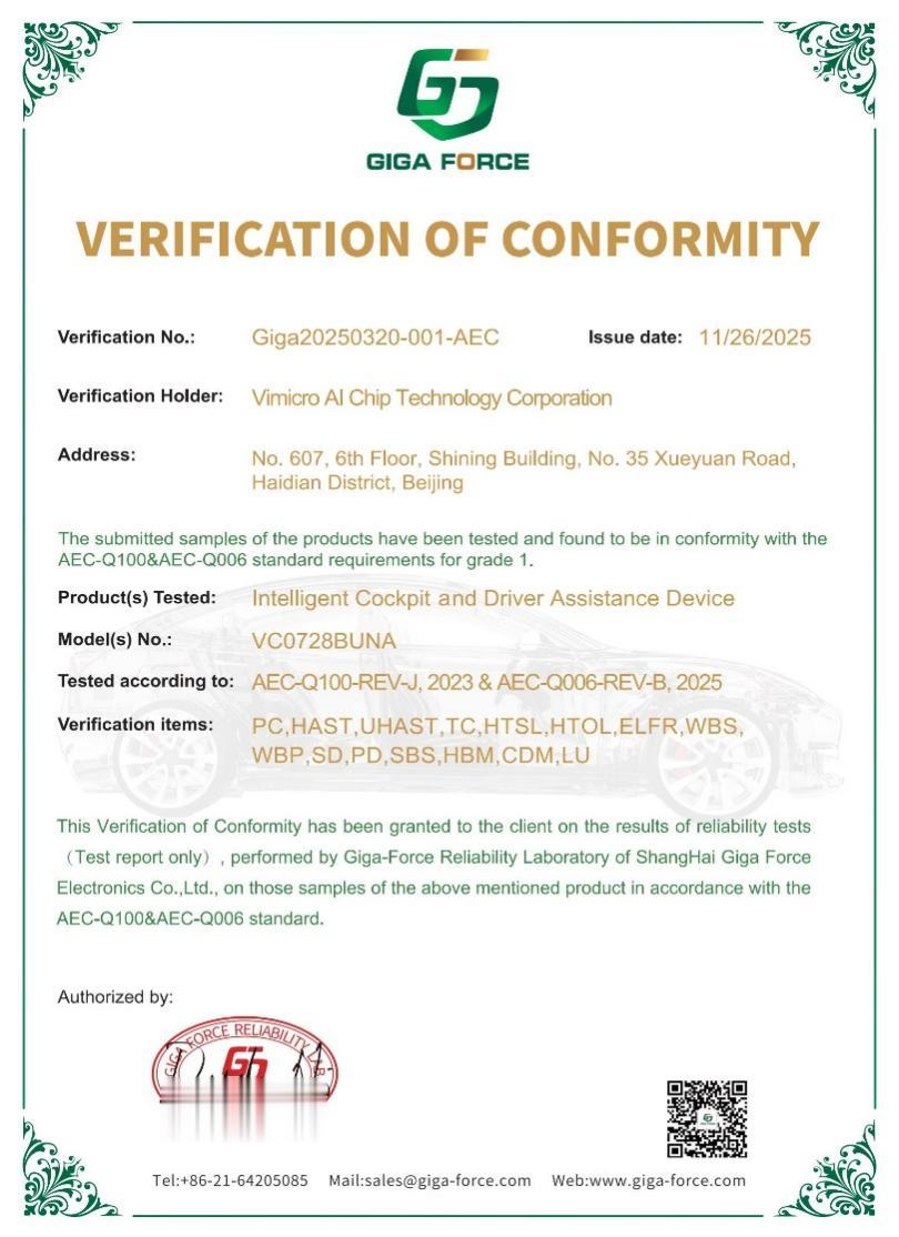 AEC-Q100是由汽车电子委员会(AutomotiveElectronicsCouncil)发布的集成电路应力测试认证标准,是车规级芯片必须通过的核心可靠性测试,也是全球汽车芯片领域公认的权威准入门槛。通过此认证,意味着“星光智能四号”可用于包括高级驾驶辅助系统、车载视觉感知系统、智能驾舱监控等在内的核心汽车电子场景,为智能汽车提供安全可靠的前端“视觉大脑”。