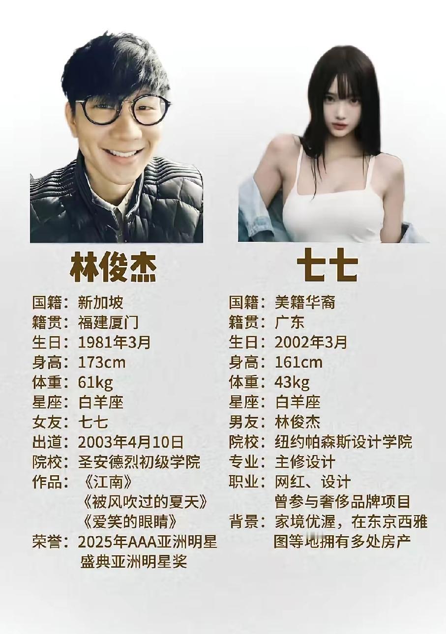 林俊杰的爱情让人非常羡慕, 他和网红七七也算是郎才女貌, 尽管双方的年龄差距达到21岁, 但是两个人在一起就是缘分。 正如林俊杰歌里唱的, 爱有万分之一甜,缘分写在三生石上面。 林俊杰作为知名的歌手,他是事业有成, 而网红七七的身份背景也不简单, 她曾参与过很多奢侈品牌的设计, 家里面的家庭也是非常优渥, 所以两个人在一起是门当户对。