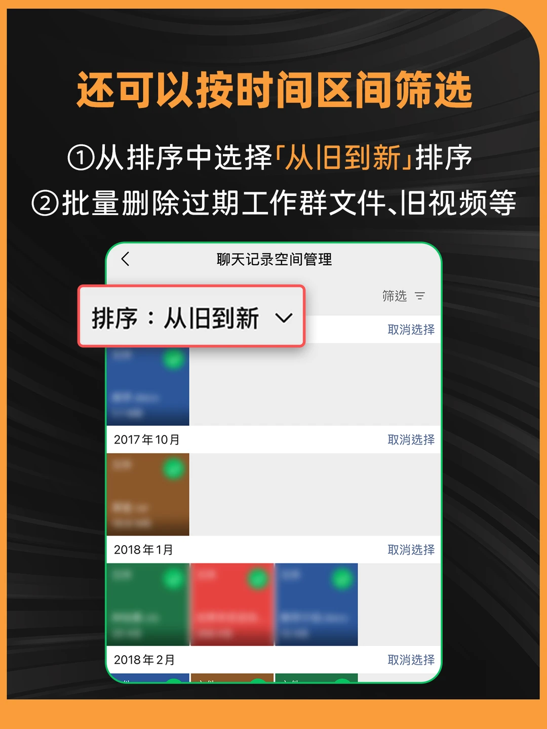 👉🏻 步骤:从排序中选择“从旧到新”排序 ➡️ 批量删除过期工作群文件、旧视频等。