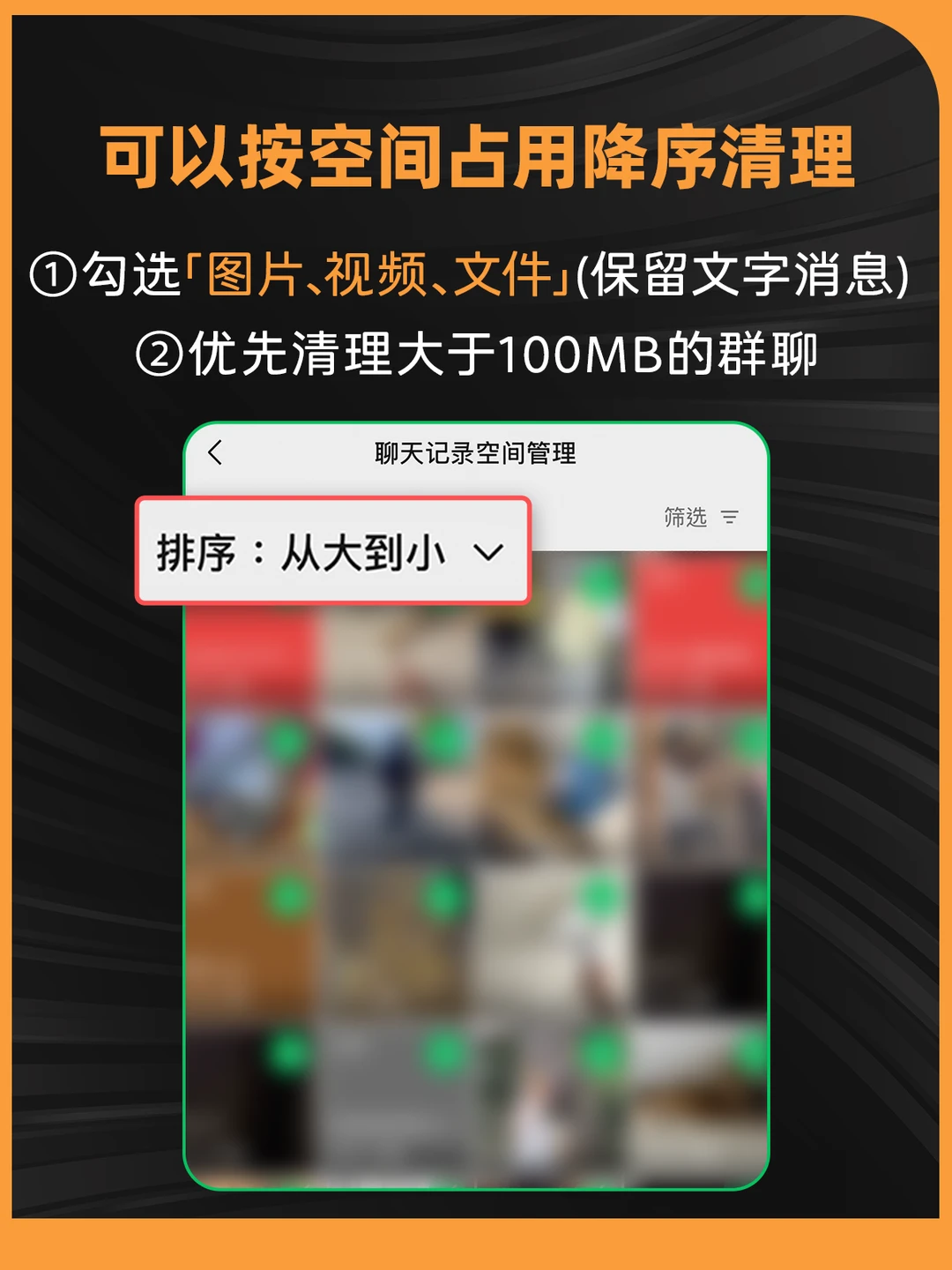👉🏻 步骤:勾选「图片、视频、文件」(保留文字消息) ➡️ 优先清理大于100MB的群聊。