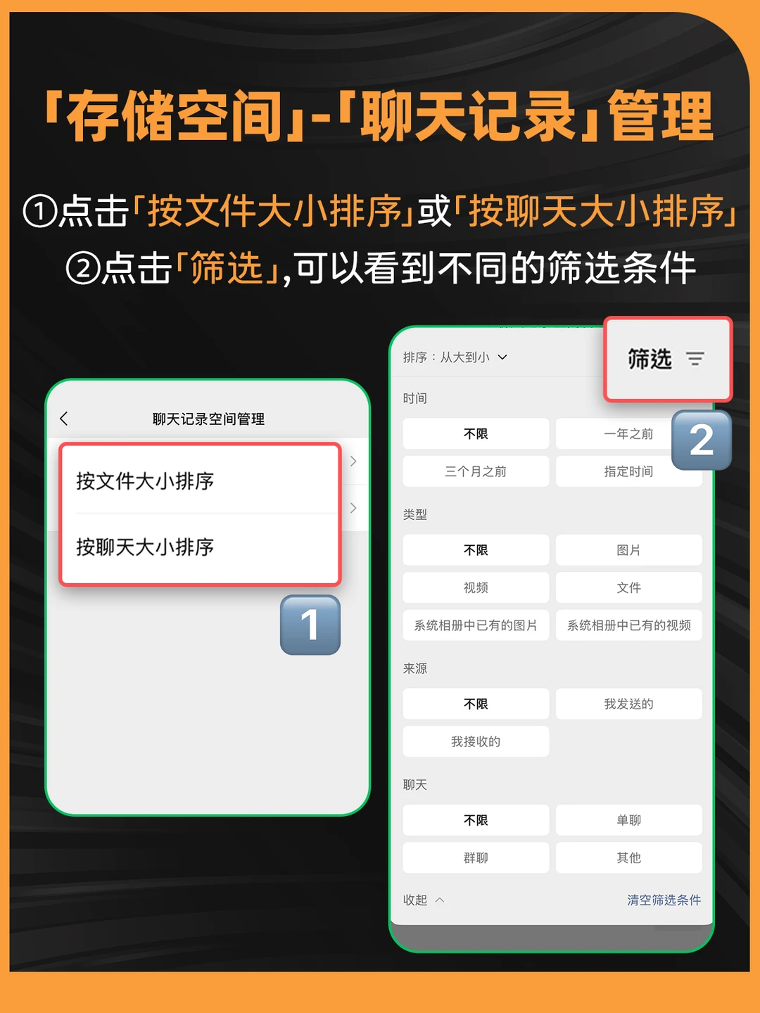 这里面有「按文件大小排序」、「按聊天大小排序」,可以根据不同条件进行筛选。