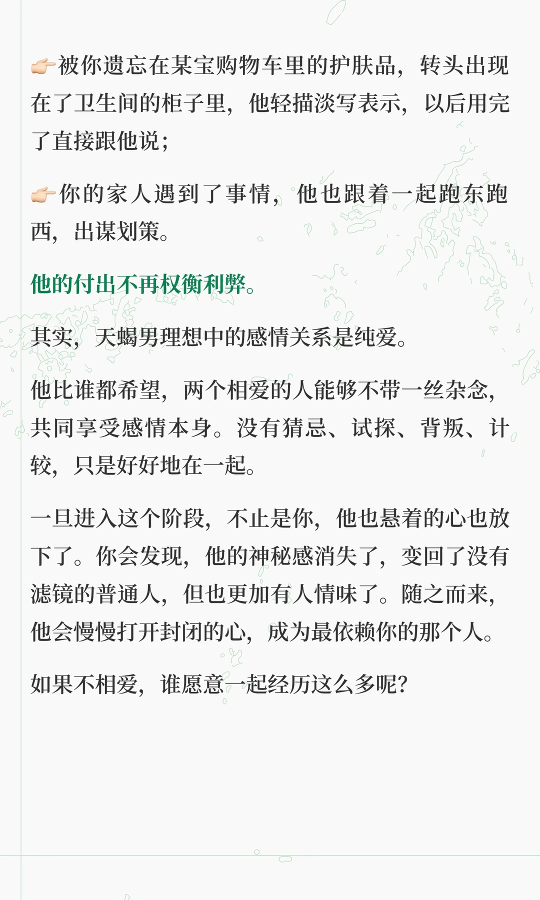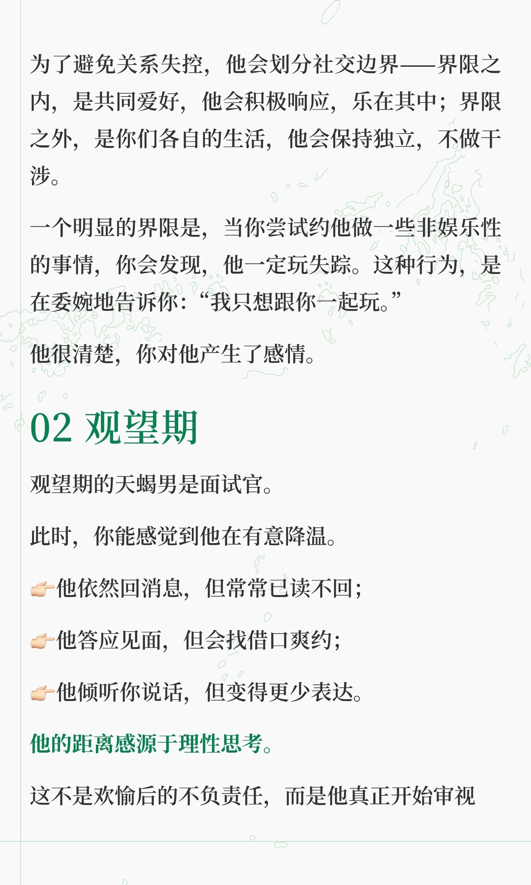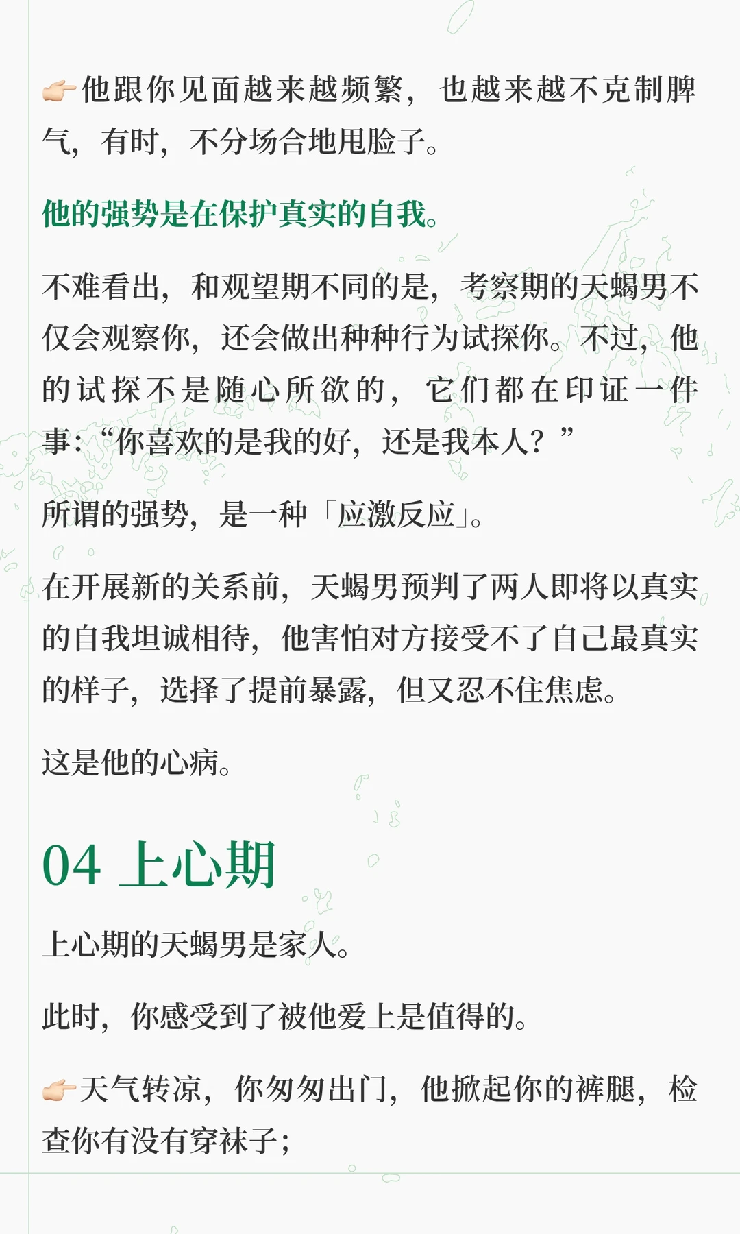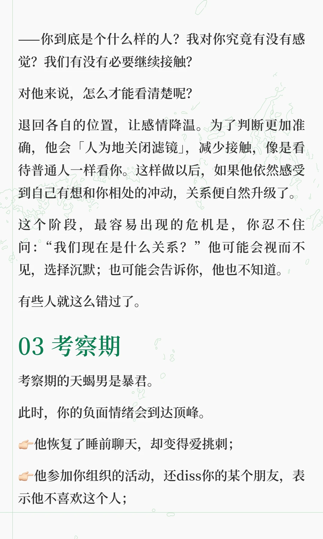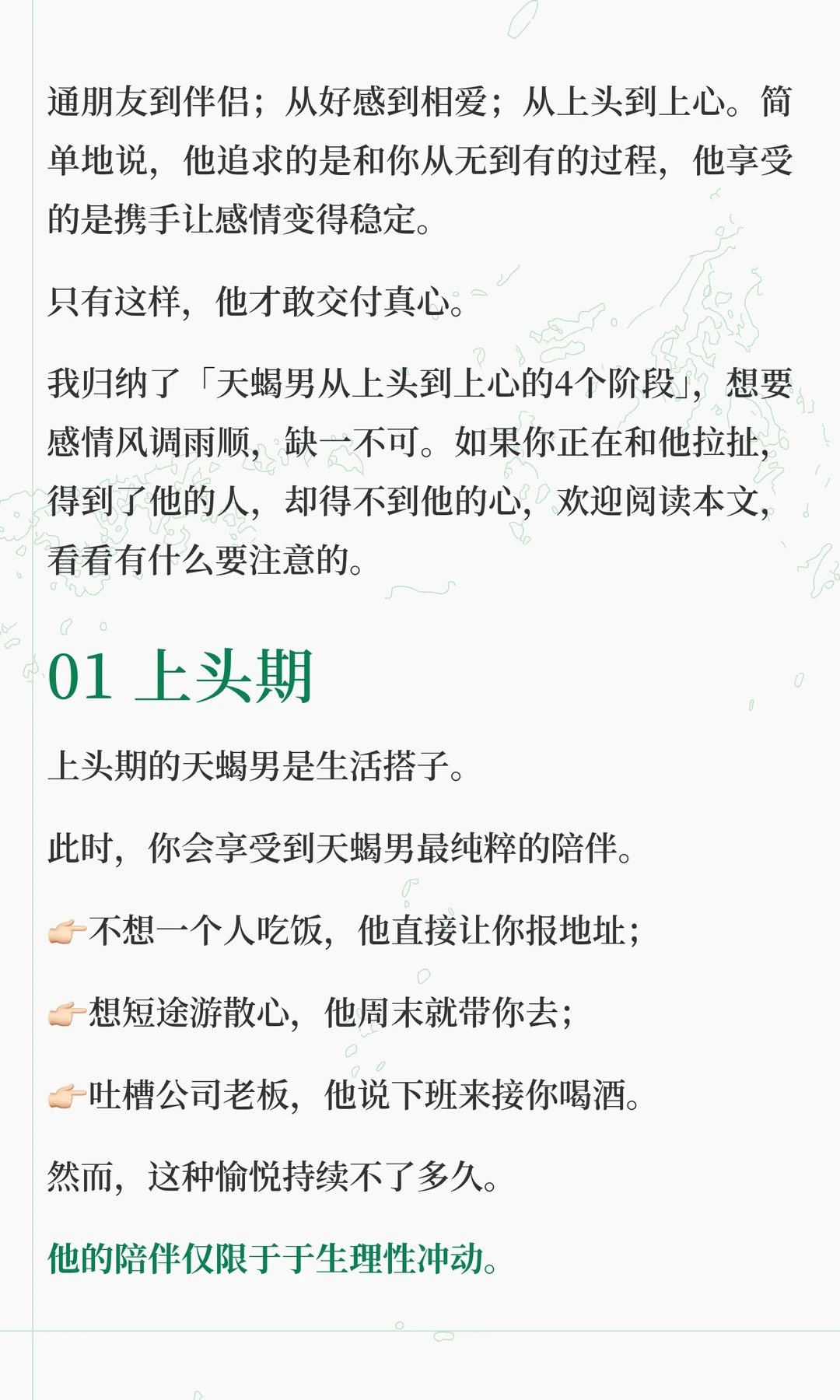 天蝎男在感情中追求的是从无到有的过程,他想和你从普通朋友到伴侣;从好感到相爱;从上头到上心。只有这样,他才敢交付真心。其中,你们会经历4个阶段,想要感情风调雨顺,缺一不可。