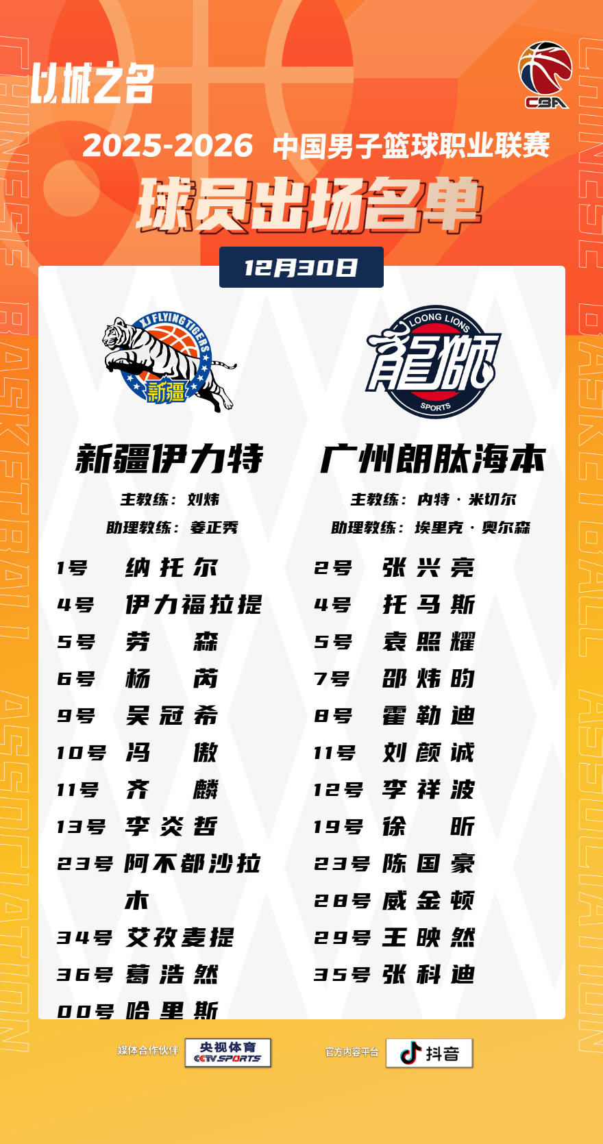 虎扑12月30日讯今晚CBA常规赛,新疆对阵广州的大名单已经公布。
