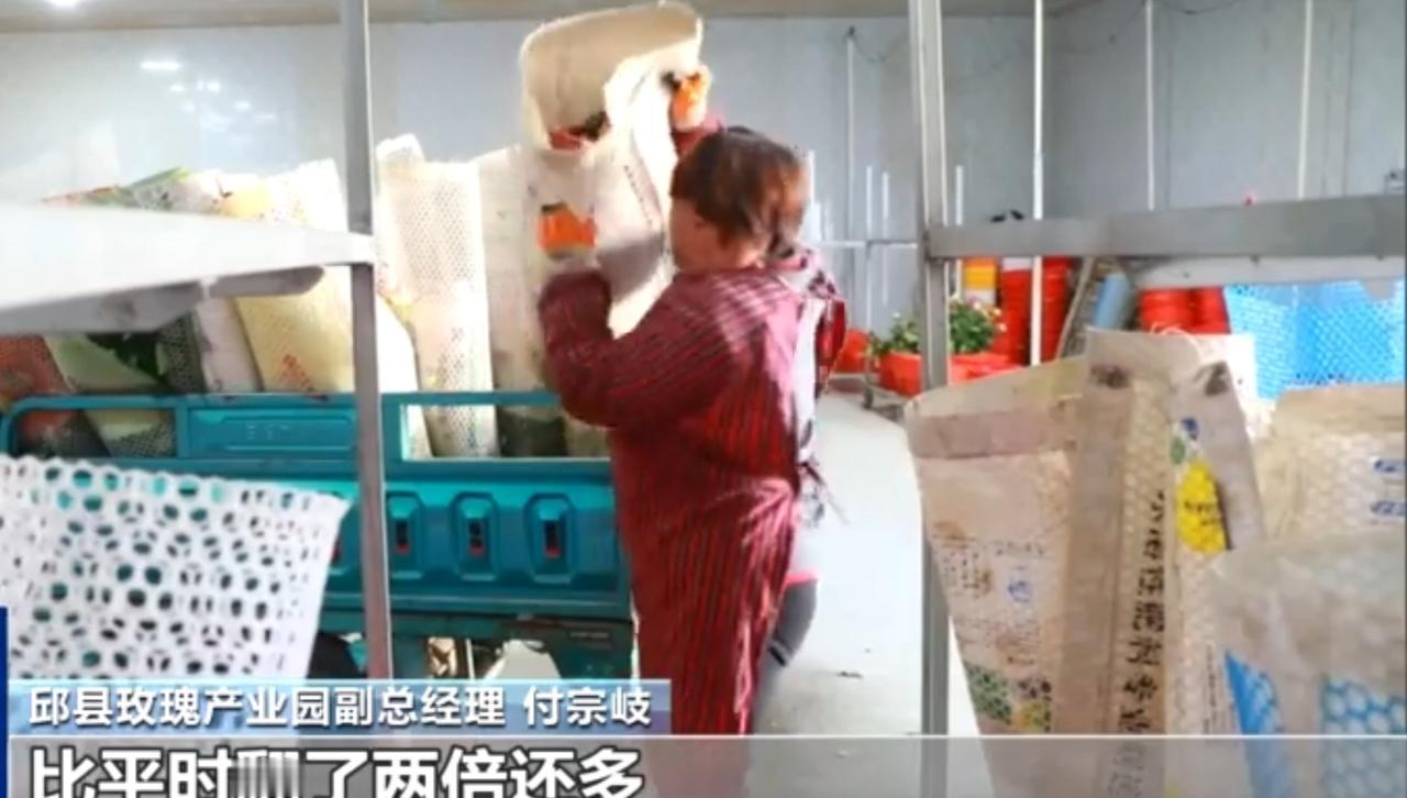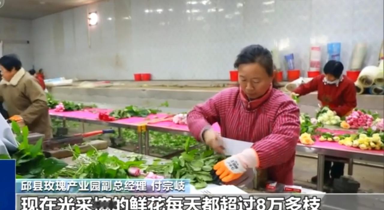 邱县玫瑰产业园内一派繁忙:工人们在流水线上加紧处理鲜花,分拣、包装、装车等工序有序推进。产业园副总经理付宗岐介绍,节日临近鲜花需求激增,单日采摘量超8万枝,订单量较平日翻了两倍多。这火热的生产场景,既反映出花卉消费市场的旺盛需求,也彰显了地方特色玫瑰产业的发展活力。