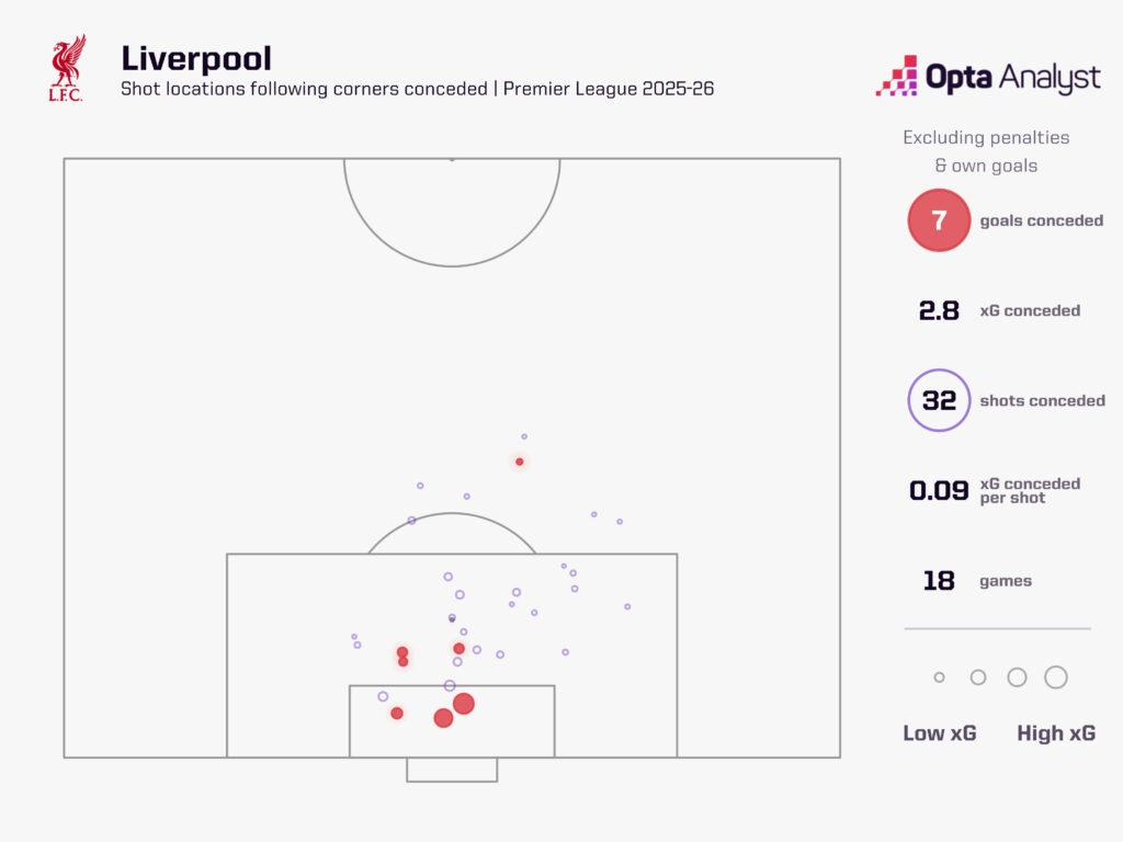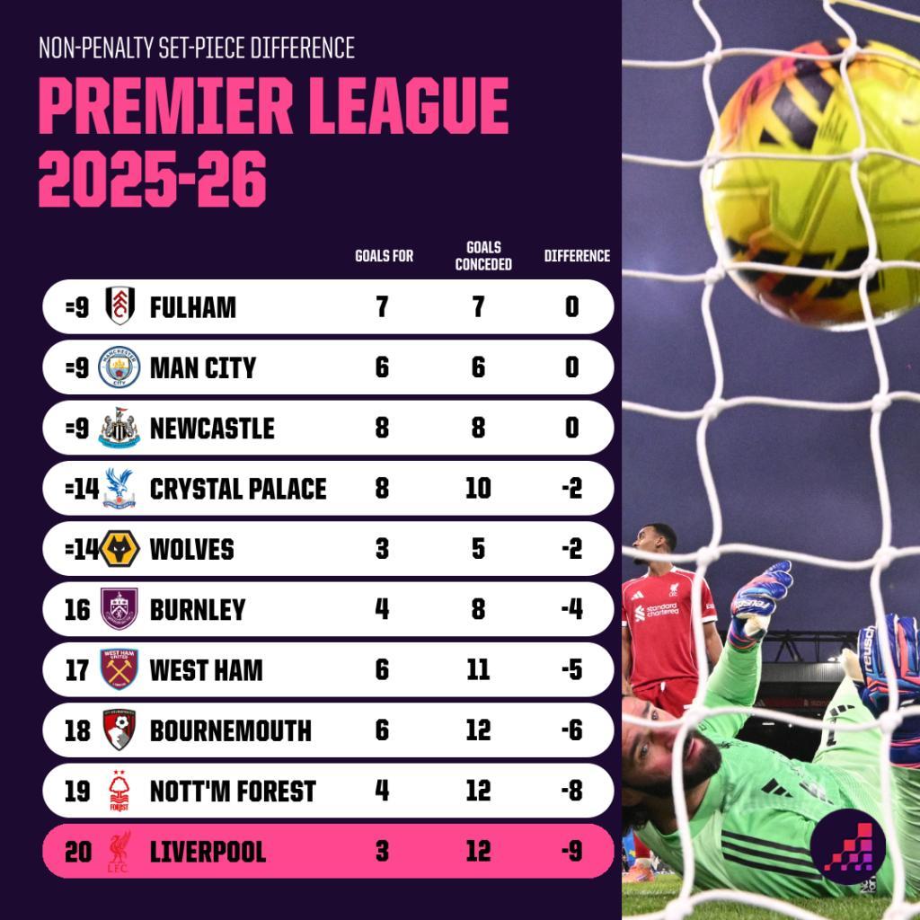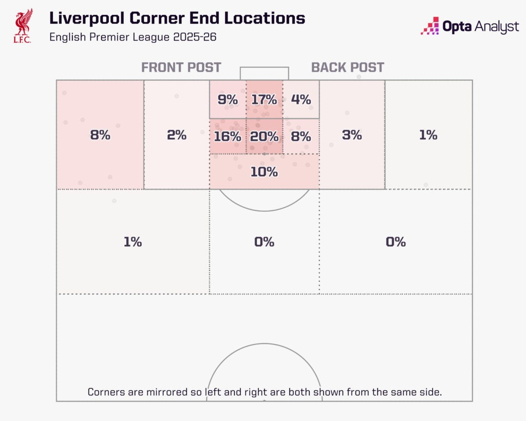 利物浦必须攻克定位球顽疾📣本赛季,在欧洲五大联赛中,没有哪支球队的定位球丢球数比利物浦更多;而在进攻端,红军的定位球威胁同样乏善可陈。身为英超卫冕冠军,他们究竟是哪里出了问题?周六尽管全取三分,但面对联赛积分榜垫底的对手,这场主场比赛并非一帆风顺,而罪魁祸首正是球队那老生常谈的致命短板。上半场,利物浦完全掌控比赛节奏,然而下半场伊始,圣地亚哥·布埃诺的破门帮助狼队扳回一城,将比分差距缩小。和本赛季多粒丢球如出一辙,这粒失球同样源自定位球。这已经是利物浦本赛季英超联赛中丢掉的第12粒非点球定位球,这一数据与伯恩茅斯、诺丁汉森林并列联赛榜首。事实上,放眼全欧洲五大联赛,利物浦的定位球丢球数也高居第一。虽然近两场比赛都如愿全取三分,考虑到本赛季大部分时间里球队的状态都不尽如人意,这样的结果自然不容小觑,但利物浦眼下最不需要的,就是徒增的比赛压力。对于卫冕冠军而言,这无疑是个棘手的难题。自2015-16赛季(丢15球)以来,利物浦还从未在单季英超联赛中丢掉过12粒以上的非点球定位球,而如今2025-26赛季的赛程尚未过半。本赛季已因对手的远距离手抛球丢掉3球,这一数据与纽卡并列英超第一;此外还因任意球丢了2球。不过,最令人担忧的还是球队在角球防守上的糟糕表现。本赛季英超,利物浦已经因角球防守失误丢掉7球,全联赛只有西汉姆(10球)的角球丢球数比他们更多。事实上,在利物浦的英超征战史上,单季角球丢球数超过本赛季的情况仅出现过三次,其中一次还是在1992-93赛季——英超元年,当时球队一共踢了42场比赛。不过,这一问题其实是本赛季才新出现的。上赛季,利物浦的非点球定位球丢球数仅为9粒,角球丢球更是只有3粒,全英超只有维拉(2粒)的角球丢球数比他们更少。上赛季,利物浦直到1月下旬才在联赛中首次因角球丢球,当时球队在对阵伊普斯维奇的比赛中早已4-0遥遥领先,那粒失球不过是对手挽回颜面的安慰球。也就是说,在上赛季的同一时间节点,利物浦的角球防守还保持着零失球的完美纪录。当然,这在很大程度上也与本赛季英超联赛定位球进球数激增的大趋势有关。2025-26赛季,英超联赛28.6%的进球都来自非点球定位球,503粒总进球中占了144粒;而在上赛季,这一比例仅为20.6%。那么,这仅仅是运气不佳所致,还是背后存在着显而易见的规律?逐一复盘利物浦本赛季联赛中丢掉的12粒定位球。不难看出,利物浦的问题似乎出在**第一落点的后续反应**上。这12粒丢球,没有一粒是对手通过定位球第一落点直接破门的,其中多粒失球都是源于解围失误或皮球折射后,对手二次进攻打入的。如果利物浦能在进攻端的定位球战术中多点开花,或许防守端的这些问题还能被容忍,但事实恰恰相反。本赛季英超联赛,利物浦仅打入3粒非点球定位球,这一数据在联赛中垫底;球队的定位球进球占非点球总进球的比例仅为10%,同样是全联赛最低。2025-26赛季,利物浦的定位球净进球数为-9,是英超联赛中最差的;他们也是联赛中仅有的七支定位球净进球数为负的球队之一。在积分榜上半区球队中,只有利物浦、诺丁汉森林(-8)、伯恩茅斯(-6)和水晶宫(-2)的定位球净进球数为负。相比之下,联赛领头羊阿森纳的定位球净进球数为+8,紧随其后的是热刺(+7)、曼联(+5)和桑德兰(+5)。在对阵狼队的赛前新闻发布会上,斯洛特也坦言,球队必须在定位球攻防上有所改进。有观点认为,利物浦定位球进攻威胁不足,部分原因在于球队没有顺应联赛主流趋势,减少了内旋角球的战术使用。本赛季英超联赛中,仅有四支球队的内旋角球占比低于70%,利物浦便是其中之一。与此同时,利物浦的外旋角球占比高达42.7%,位居联赛第一——这意味着皮球的落点通常离对方球门更远。但这绝非唯一原因,利兹联的外旋角球占比同样高达42.1%,排名联赛第二,却在定位球进攻中收获颇丰,打入6粒进球。从下方的角球落点分布图中可以清晰看到,对手开出的角球第一落点,远比利物浦自己的角球落点更靠近球门——对手26%的角球第一落点,都直接落在了球门中路的六码区,也就是门将的正前方。不过,单从数据来看,利物浦的角球防守实际表现,并不像丢球数所显示的那般糟糕。利物浦的角球预期失球数仅为0.53,在英超联赛中排名第三,仅次于曼城和布伦特福德。在对手的角球进攻中,利物浦仅有12.9%的概率会让对手直接形成射门,这一比例在联赛中仅高于四支球队。事实上,利物浦本赛季7粒角球丢球,对应的预期失球数仅为2.8,在联赛中也仅高于五支球队。这也正是斯洛特的论点所在。尽管球队在定位球防守中偶有松懈,但平心而论,他们的运气确实欠佳。利物浦的定位球净进球数为-9,但根据预期进球数据计算,他们的定位球净预期进球数仅为-1.6;球队的非点球定位球预期进球数为4.3,而预期失球数为5.9。此外,利物浦本赛季定位球进攻表现的大幅下滑也颇为令人费解。上赛季,球队共打入10粒非点球定位球,其中8粒来自角球,这一数据在联赛中排名前五。不过,利物浦上赛季之所以能问鼎英超冠军,很大程度上要归功于球队在运动战中的高效表现——他们共打入67粒运动战进球,比曼城多出5粒,比联赛其他球队至少多出17粒。本赛季,利物浦的运动战火力依旧强劲,26粒运动战进球仅次于曼城,比其他球队至少多出6粒;球队的运动战射门次数达到214次,位