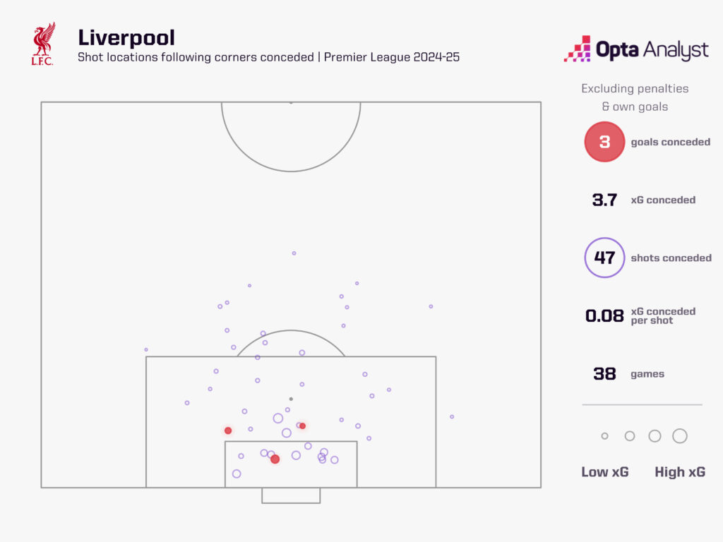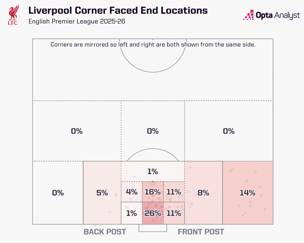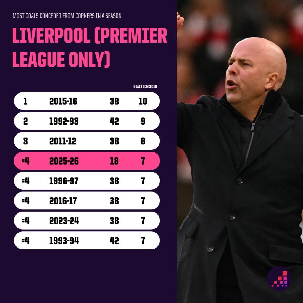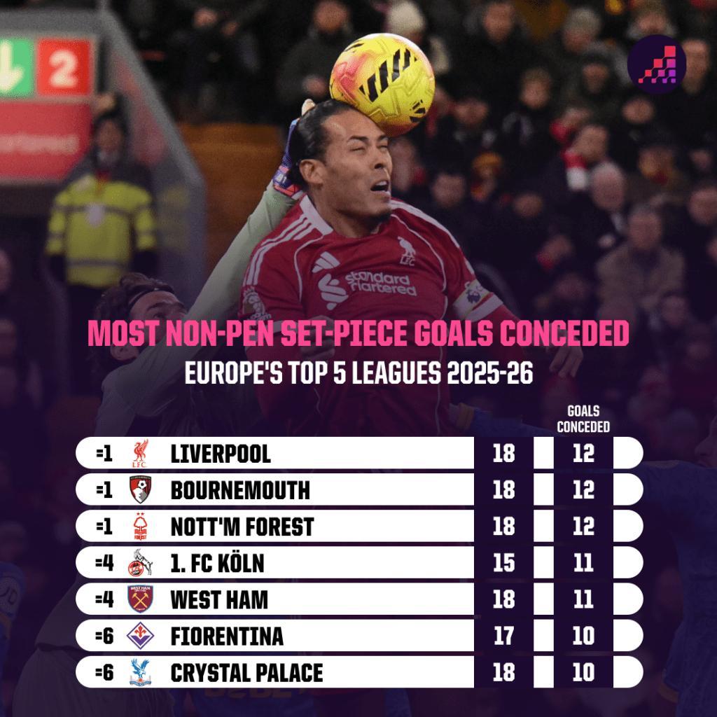 利物浦必须攻克定位球顽疾📣本赛季,在欧洲五大联赛中,没有哪支球队的定位球丢球数比利物浦更多;而在进攻端,红军的定位球威胁同样乏善可陈。身为英超卫冕冠军,他们究竟是哪里出了问题?周六尽管全取三分,但面对联赛积分榜垫底的对手,这场主场比赛并非一帆风顺,而罪魁祸首正是球队那老生常谈的致命短板。上半场,利物浦完全掌控比赛节奏,然而下半场伊始,圣地亚哥·布埃诺的破门帮助狼队扳回一城,将比分差距缩小。和本赛季多粒丢球如出一辙,这粒失球同样源自定位球。这已经是利物浦本赛季英超联赛中丢掉的第12粒非点球定位球,这一数据与伯恩茅斯、诺丁汉森林并列联赛榜首。事实上,放眼全欧洲五大联赛,利物浦的定位球丢球数也高居第一。虽然近两场比赛都如愿全取三分,考虑到本赛季大部分时间里球队的状态都不尽如人意,这样的结果自然不容小觑,但利物浦眼下最不需要的,就是徒增的比赛压力。对于卫冕冠军而言,这无疑是个棘手的难题。自2015-16赛季(丢15球)以来,利物浦还从未在单季英超联赛中丢掉过12粒以上的非点球定位球,而如今2025-26赛季的赛程尚未过半。本赛季已因对手的远距离手抛球丢掉3球,这一数据与纽卡并列英超第一;此外还因任意球丢了2球。不过,最令人担忧的还是球队在角球防守上的糟糕表现。本赛季英超,利物浦已经因角球防守失误丢掉7球,全联赛只有西汉姆(10球)的角球丢球数比他们更多。事实上,在利物浦的英超征战史上,单季角球丢球数超过本赛季的情况仅出现过三次,其中一次还是在1992-93赛季——英超元年,当时球队一共踢了42场比赛。不过,这一问题其实是本赛季才新出现的。上赛季,利物浦的非点球定位球丢球数仅为9粒,角球丢球更是只有3粒,全英超只有维拉(2粒)的角球丢球数比他们更少。上赛季,利物浦直到1月下旬才在联赛中首次因角球丢球,当时球队在对阵伊普斯维奇的比赛中早已4-0遥遥领先,那粒失球不过是对手挽回颜面的安慰球。也就是说,在上赛季的同一时间节点,利物浦的角球防守还保持着零失球的完美纪录。当然,这在很大程度上也与本赛季英超联赛定位球进球数激增的大趋势有关。2025-26赛季,英超联赛28.6%的进球都来自非点球定位球,503粒总进球中占了144粒;而在上赛季,这一比例仅为20.6%。那么,这仅仅是运气不佳所致,还是背后存在着显而易见的规律?逐一复盘利物浦本赛季联赛中丢掉的12粒定位球。不难看出,利物浦的问题似乎出在**第一落点的后续反应**上。这12粒丢球,没有一粒是对手通过定位球第一落点直接破门的,其中多粒失球都是源于解围失误或皮球折射后,对手二次进攻打入的。如果利物浦能在进攻端的定位球战术中多点开花,或许防守端的这些问题还能被容忍,但事实恰恰相反。本赛季英超联赛,利物浦仅打入3粒非点球定位球,这一数据在联赛中垫底;球队的定位球进球占非点球总进球的比例仅为10%,同样是全联赛最低。2025-26赛季,利物浦的定位球净进球数为-9,是英超联赛中最差的;他们也是联赛中仅有的七支定位球净进球数为负的球队之一。在积分榜上半区球队中,只有利物浦、诺丁汉森林(-8)、伯恩茅斯(-6)和水晶宫(-2)的定位球净进球数为负。相比之下,联赛领头羊阿森纳的定位球净进球数为+8,紧随其后的是热刺(+7)、曼联(+5)和桑德兰(+5)。在对阵狼队的赛前新闻发布会上,斯洛特也坦言,球队必须在定位球攻防上有所改进。有观点认为,利物浦定位球进攻威胁不足,部分原因在于球队没有顺应联赛主流趋势,减少了内旋角球的战术使用。本赛季英超联赛中,仅有四支球队的内旋角球占比低于70%,利物浦便是其中之一。与此同时,利物浦的外旋角球占比高达42.7%,位居联赛第一——这意味着皮球的落点通常离对方球门更远。但这绝非唯一原因,利兹联的外旋角球占比同样高达42.1%,排名联赛第二,却在定位球进攻中收获颇丰,打入6粒进球。从下方的角球落点分布图中可以清晰看到,对手开出的角球第一落点,远比利物浦自己的角球落点更靠近球门——对手26%的角球第一落点,都直接落在了球门中路的六码区,也就是门将的正前方。不过,单从数据来看,利物浦的角球防守实际表现,并不像丢球数所显示的那般糟糕。利物浦的角球预期失球数仅为0.53,在英超联赛中排名第三,仅次于曼城和布伦特福德。在对手的角球进攻中,利物浦仅有12.9%的概率会让对手直接形成射门,这一比例在联赛中仅高于四支球队。事实上,利物浦本赛季7粒角球丢球,对应的预期失球数仅为2.8,在联赛中也仅高于五支球队。这也正是斯洛特的论点所在。尽管球队在定位球防守中偶有松懈,但平心而论,他们的运气确实欠佳。利物浦的定位球净进球数为-9,但根据预期进球数据计算,他们的定位球净预期进球数仅为-1.6;球队的非点球定位球预期进球数为4.3,而预期失球数为5.9。此外,利物浦本赛季定位球进攻表现的大幅下滑也颇为令人费解。上赛季,球队共打入10粒非点球定位球,其中8粒来自角球,这一数据在联赛中排名前五。不过,利物浦上赛季之所以能问鼎英超冠军,很大程度上要归功于球队在运动战中的高效表现——他们共打入67粒运动战进球,比曼城多出5粒,比联赛其他球队至少多出17粒。本赛季,利物浦的运动战火力依旧强劲,26粒运动战进球仅次于曼城,比其他球队至少多出6粒;球队的运动战射门次数达到214次,位
