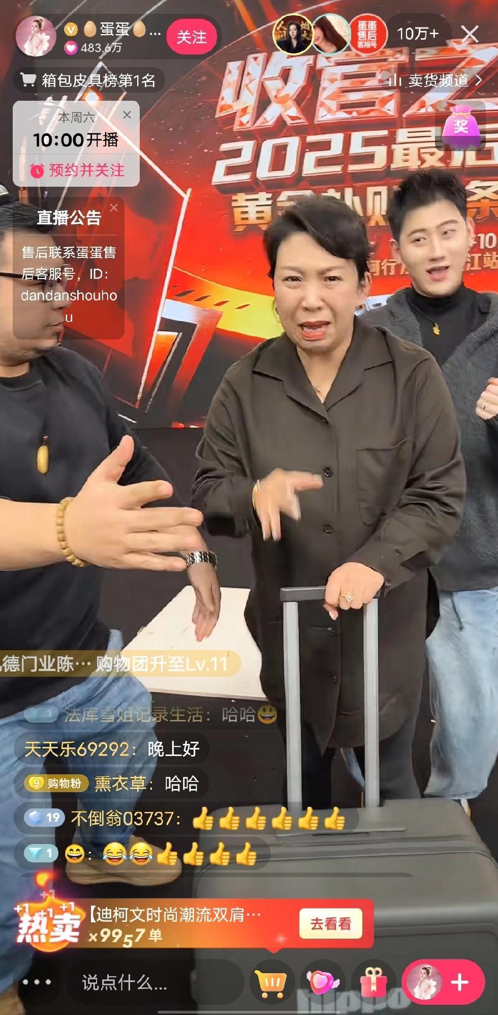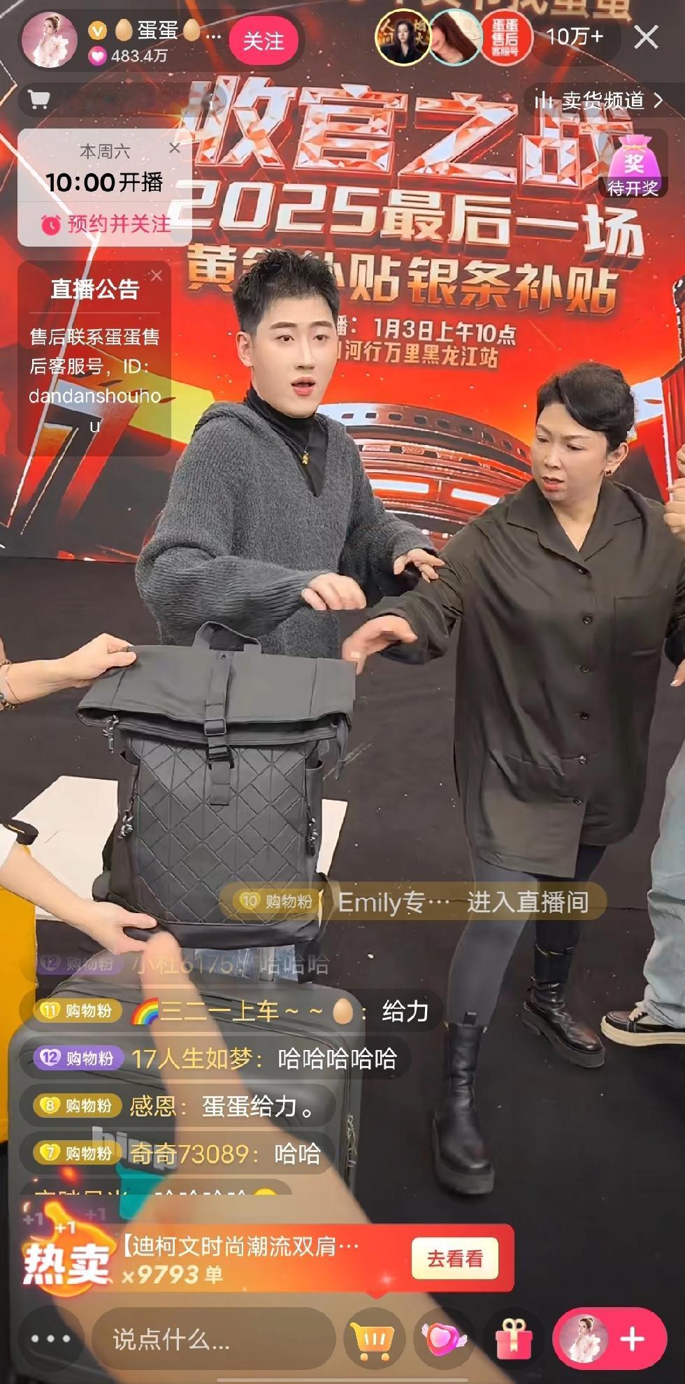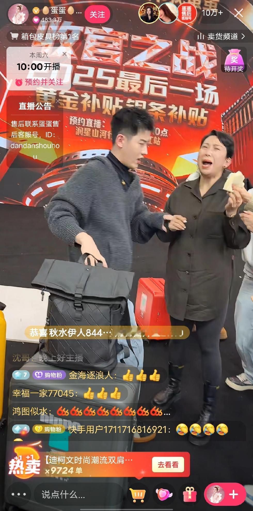 蛋蛋直播间卖包包。 599直播间卖69,老板干急眼了,不卖了,不卖了,愤怒的转身走人。蛋蛋乐呵呵声称老板得赔哭了。 老板嗷嗷喊“599”、“599”。 直播间到底是在演戏还是真的599卖69.9?如果是真的,那“赔哭”一定是真的,老板急头白脸就正常了,显示成交1.2万单。 问题是现在演戏的直播间太多了,剧本太多了。实在是很难弄清楚真假。 重点是直播间并没有标注是“演绎”。