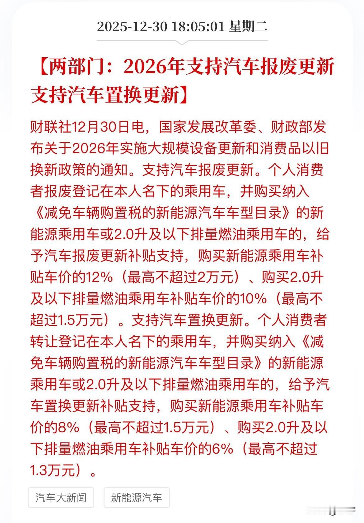 2025年 vs 2026年 “以旧换新”政策核心差异对比,利好股市哪些板块? 最大的变化在于补贴计算方式的改变(从定额变成按比例)、支持范围的聚焦以及新增了智能产品品类。 1、汽车报废更新 2025: 新能源:2万元燃油车:1.5万元(定额) 2026: 新能源:车价12%(封顶2万)燃油车:车价10%(封顶1.5万) 2、汽车置换更新 2025: 地区标准不一 2026: 新能源:车价8%(封顶1.5万) 燃油车:车价6%(封顶1.3万) 3、家电以旧换新 2025: 补贴1级/2级能效、比例最高20% 2026: 仅补贴1级能效、统一补贴售价15%(封顶1500元) 4、数码/智能产品 2025: 手机、平板 2026: 新增智能眼镜、智能家居、适老化家居,统一补贴售价15%(封顶500元) 核心变化 1、补贴方式转变:从定额补贴全面转向按比例补贴,更体现车辆/产品价值差异。 2、门槛提高:家电补贴聚焦最高等级的1级能效产品。 3、品类扩容:新增智能穿戴、智能家居等新兴消费品类。 4、标准统一:全国实行统一补贴标准,消除地区差异。 总的来说,2026年的新政策对A股投资方向的启示可以概括为 “弃粗取精,聚焦升级” 。它要求投资者: 1、在汽车领域,更多关注自主品牌高端化和智能化核心供应链。 2、在家电领域,重点关注符合最高能效标准的龙头公司及上游技术部件。 3、同时,将智能穿戴、智能家居(含适老化) 等新增赛道纳入视野。