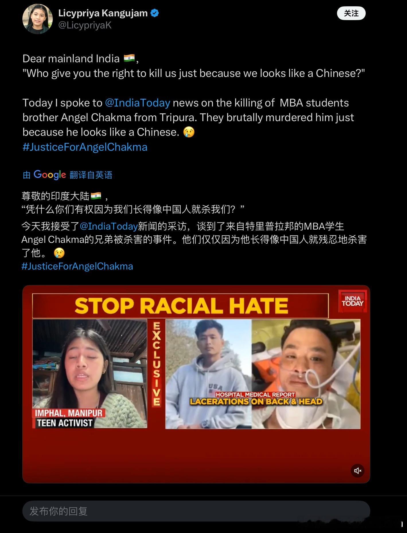 根据印度媒体报道,印度特里普拉邦发生一起“疑似种族歧视谋杀”案件,一名叫Angel Chakma的印度青年因被认为“是中国人”而遭到杀害。当地网民在网络上发声强调“我们是印度人,不是中国人”。特里普拉邦的特里普里人(又称克拉底人)在外貌上更接近东南亚特征,与一般印度人相貌存在区别,这一点在印度社会应是常识。整起事件与相关讨论,令人感觉存在刻意关联中国的嫌疑。这帮人单方面“澄清自己不是中国人”,问题是中国人也没觉得你们是啊。自己的问题自己解决好吗,勿Cue