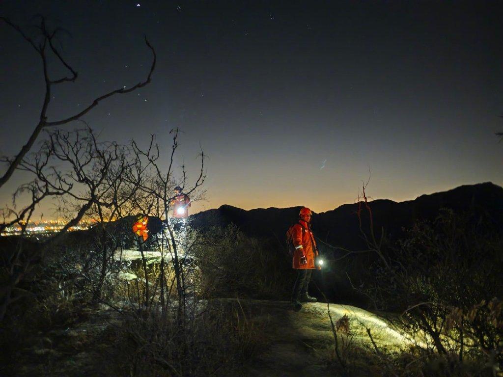 为精准锁定被困人员位置,救援人员第一时间联系民警,并找到2名熟悉当地地形的村内向导加入救援队伍,结合报警的被困人员失联前回传的微信定位,向着深山进发。夜间山路崎岖难行,救援人员相互搀扶,借助头灯辨识路径。23时36分,救援队伍抵达定位周边区域,但此时报警人的电话已无法接通,搜寻工作陷入僵局。