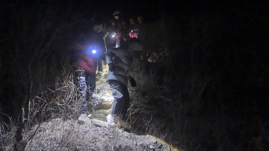 23时50分,救援人员结合向导的地形经验,推测被困人员可能在山谷低处避风,随即救援人员调整搜寻方向,慢慢下降谷底。次日0时50分,在一处隐蔽的山沟里,救援人员找到了蜷缩在一起的6名被困者,3名大人分别将3名孩子紧紧护在怀中,孩子虽无受伤但脸色冻得发白。