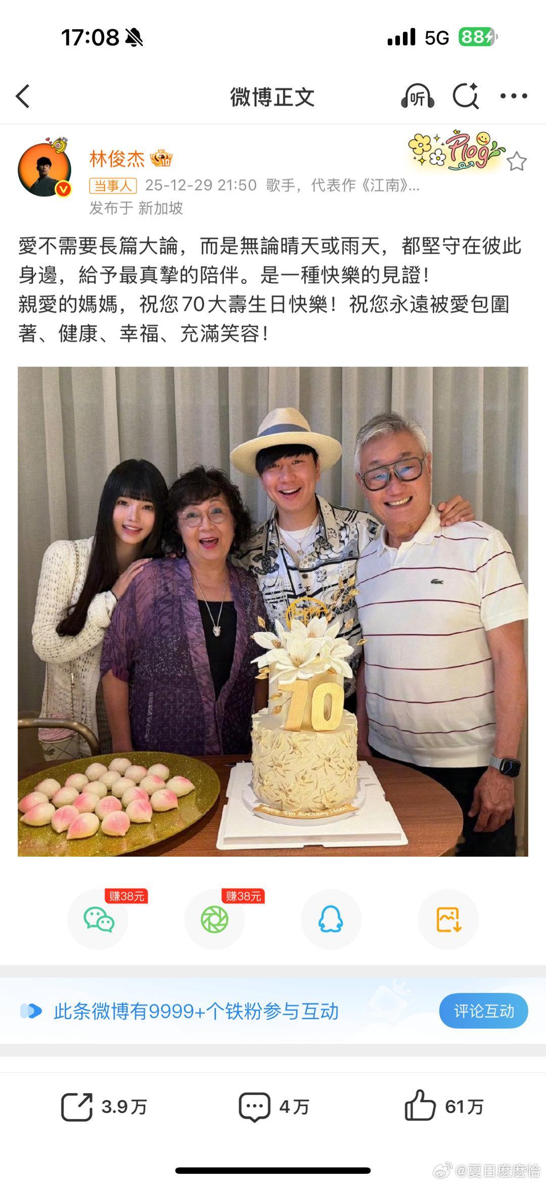 44岁的JJ借妈妈70大寿晒出全家福,正式官宣与23岁七七的恋情 照片里七七亲昵依偎林妈妈肩头,四人同框笑容超治愈,这波“见家长式官宣”诚意满分从演唱会VIP席的频繁现身,到新西兰、东京的同游踪迹,再到洛杉矶街头的情侣装同框,这段早有伏笔的感情终于尘埃落定,连周杰伦、阿信都带着奶茶梗赶来送祝福~唱了无数首遗憾情歌的“行走的CD”,终于在现实里收获圆满,网友调侃“《修炼爱情》总算修炼成功”!年龄差从不是爱的阻碍,势均力敌的双向奔赴才最动人~ 愿舞台上的深情歌手,往后永远被生活的甜包围,也期待未来能听到更多糖分超标的新歌呀!❤️