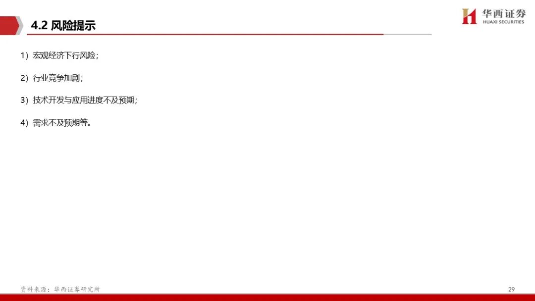 ►风险提示:1)宏观经济下行风险;2)行业竞争加剧;3)技术开发与应用进度不及预期;4)需求不及预期等。