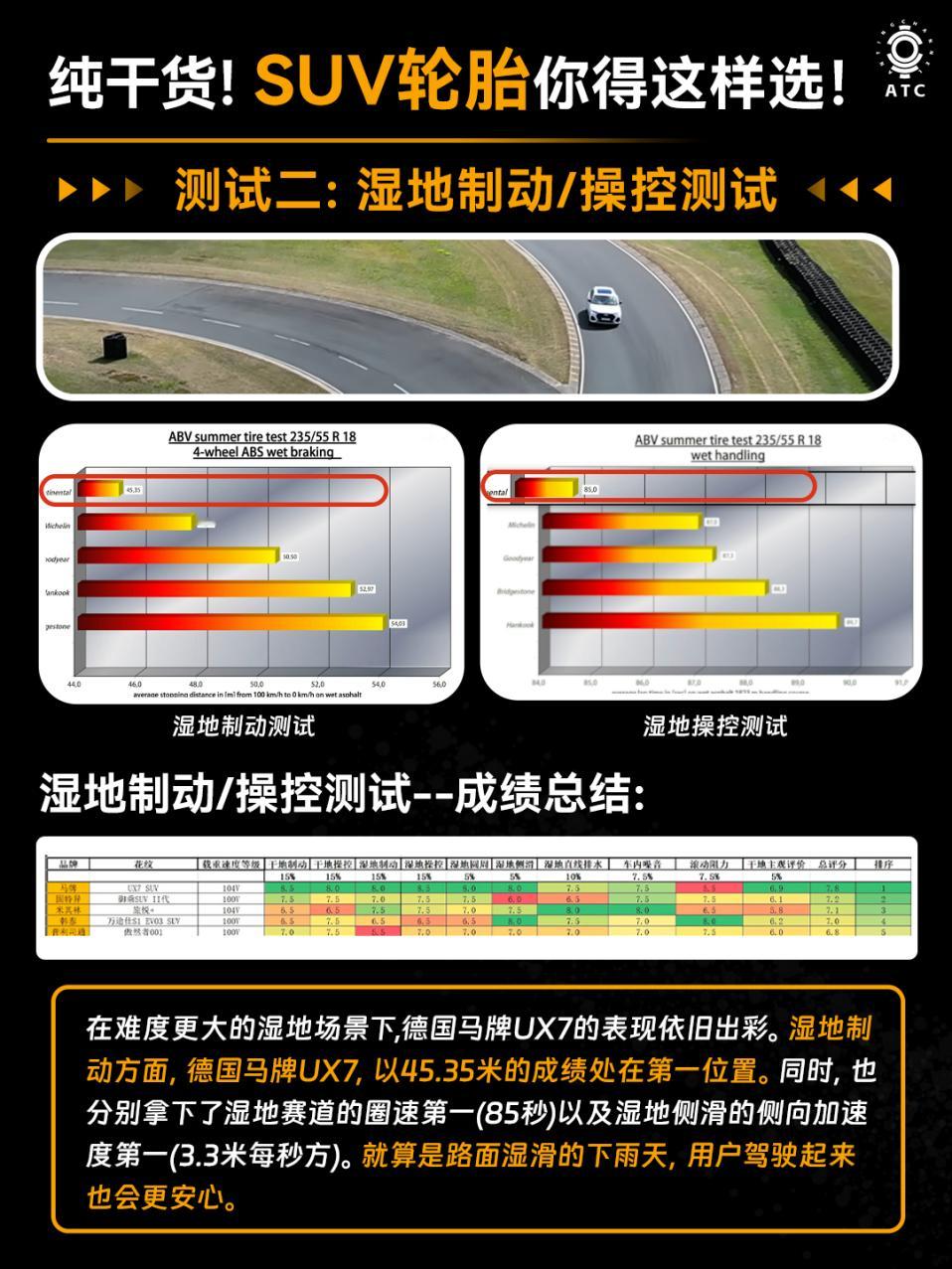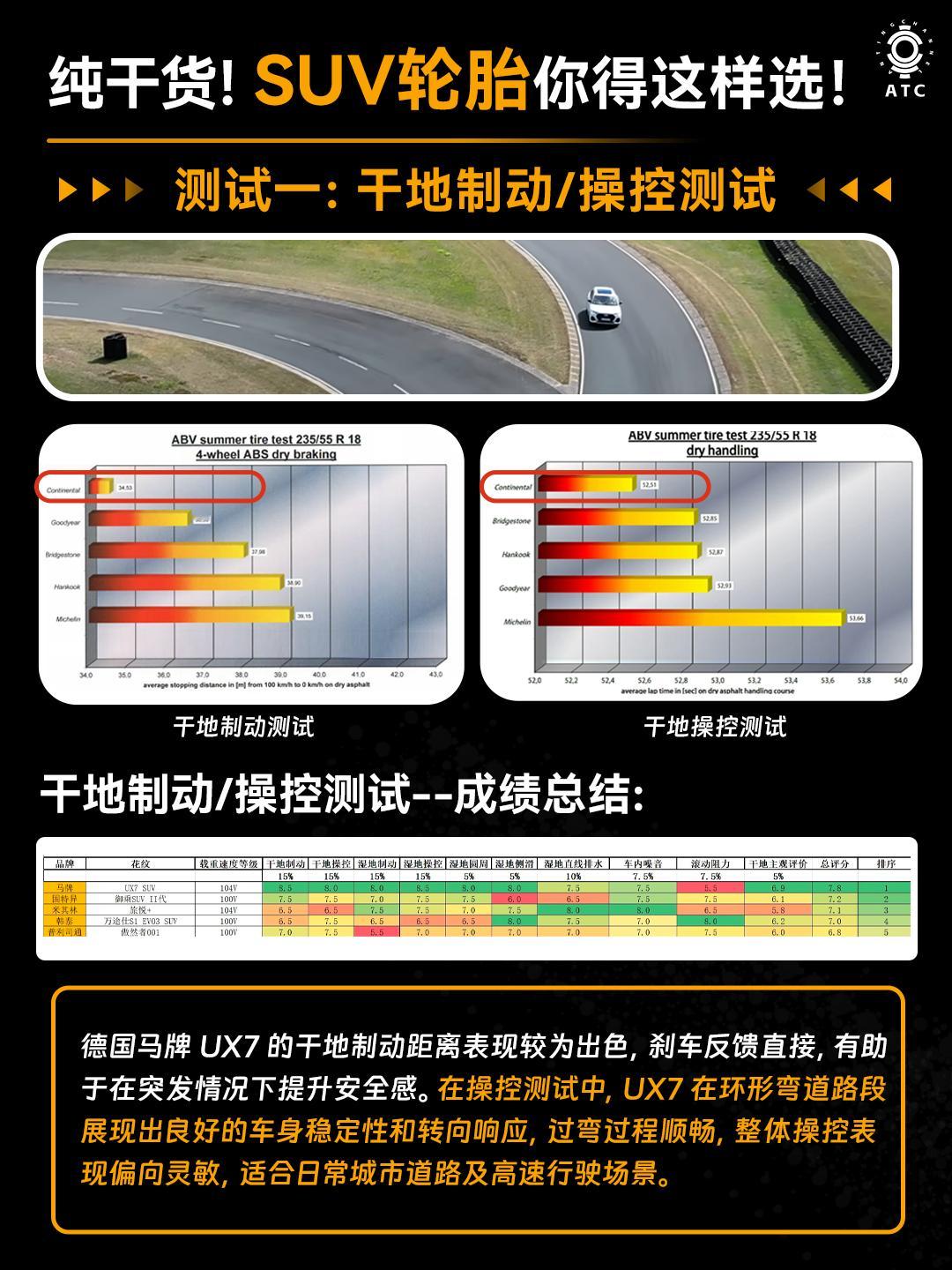 快过年了,不少家用SUV车主都琢磨着给爱车换套新轮胎——但SUV轮胎怎么选才不踩坑?是盯着品牌盲目跟风,还是对着一堆参数犯迷糊?前段时间,专业汽车媒体ABV车比得做了2025亚洲The Best SUV轮胎横评,针对干/湿地操控制动、环形弯道圈速等方面,做出排名,那今天咱也借着这份实测榜单,聊聊家用SUV轮胎,到底该怎么选不踩坑!❶日常高频的干地场景多款主流SUV轮胎在干地制动、干地操控方面都有不错表现。其中,德国马牌 UX7在干地制动和弯道测试中体现出较好的响应速度,紧急制动时给人的信心感比较足;在日常并线、过弯等场景下,操控反馈也偏清晰,适合对驾驶感受有一定要求的车主。❷雨雪天气的湿地场景湿地路况对轮胎的排水能力和抓地表现要求更高。从测试内容来看,不同轮胎在这一维度各有侧重。︎●全能选手:德国马牌UX7,湿地制动45.35米,湿地刹停距离短、操控稳、排水快,雨天开起来安全感十足!︎●排水专家:米其林旅悦+,湿地制动47.77米,同属50米以内,表现优异,且直线排水测试突出,暴雨天抗水漂能力强。❸静音&能耗·日常体验 ︎●静音标杆:米其林旅悦+适合对噪音敏感的城市通勤党;︎●节能之选:韩泰/固特异/普利司通,滚动阻力低,长期开更省油/电,适合看重经济性的车主;综上,- 以城区通勤为主,周末兼具短途旅行,那豪华均衡型轮胎德国马牌UX7,优秀的制动效率,强大的抓地力,一定是安心首选。- 追求驾乘静谧,米其林旅悦+是优选,胎噪控制出色,跑高速时车内谈话、听音乐不受影响,。- 更看重经济性固特异、普利司通这几款的表现值得关注,滚动阻力低,,对经常跑长途的车主来说,长期开下来能省不少油或电。总之,选SUV轮胎,不用盲目追大牌,关键是贴合使用场景,根据需求对号入座,才能选到不踩坑的好轮胎。