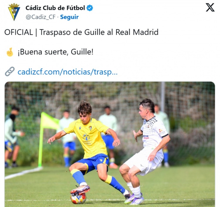 这位17岁的右后卫同时也是西班牙U18国家队成员,交易谈判进展顺利,已经正式官宣。皇家马德里青训营迎来了西班牙最具潜力的年轻球员之一:来自加的斯的17岁右后卫吉列·冈萨雷斯,他同时也是一名西班牙U18国家队成员。据《阿斯报》报道,在经过双方俱乐部长达一个月的谈判后,这位天赋异禀、潜力无限的球员最终完成了转会巴尔德贝巴斯训练基地的相关手续。