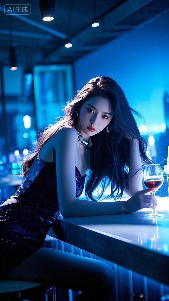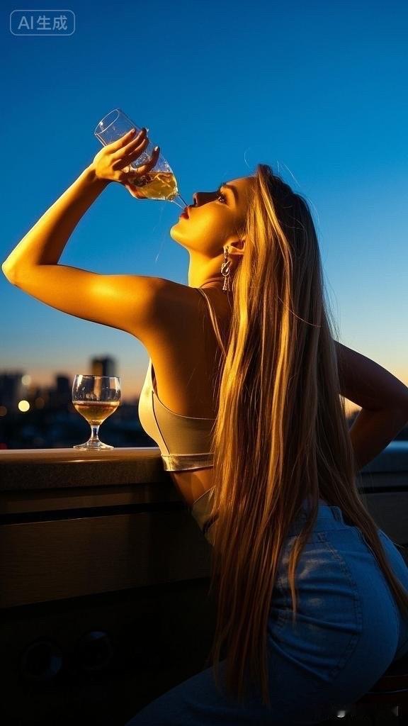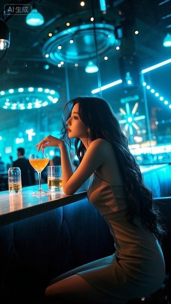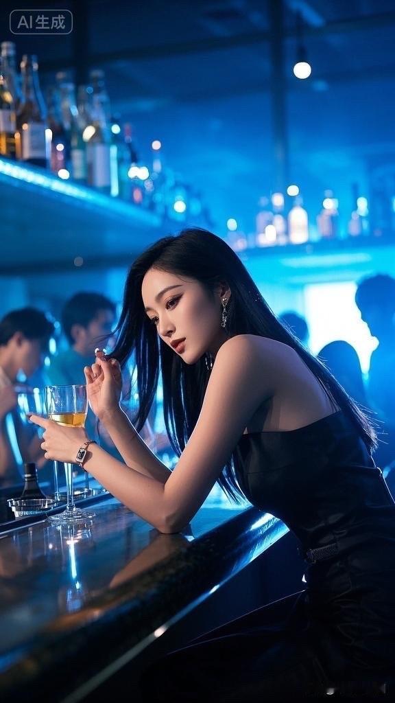 夜晚酒吧里的优雅时光,金发美人轻抿香槟,尽显迷人风情。