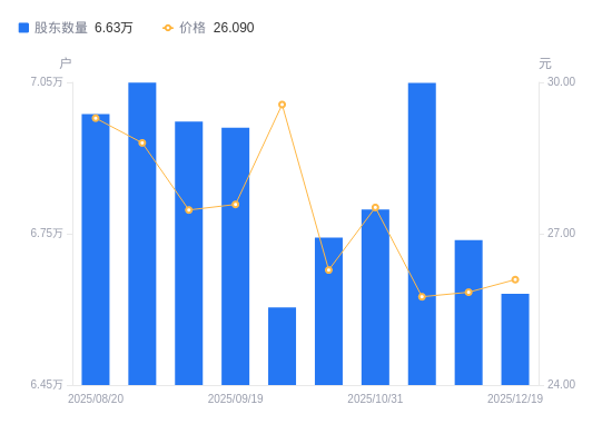 日期A股户数(户)流通A股户均持股数(股)户均持股市值(万元)2025-12-196631115192.6439.642025-11-286737114953.6138.642025-11-107048914292.1536.802025-10-316798214819.2140.782025-10-206742314942.0739.272025-09-306603615255.9145.102025-09-196960314474.0839.922025-09-106972214449.3839.692025-08-297049514559.9641.932025-08-206987014690.2043.03