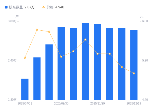 日期A股户数(户)流通A股户均持股数(股)户均持股市值(万元)2025-12-192865211892.635.872025-12-102896711763.305.962025-11-282895711767.366.282025-11-202963911496.596.142025-11-102977811442.936.442025-10-102895711767.366.342025-09-302915311688.256.172025-09-102647812869.087.452025-08-292449913908.638.112025-07-312123016050.288.44