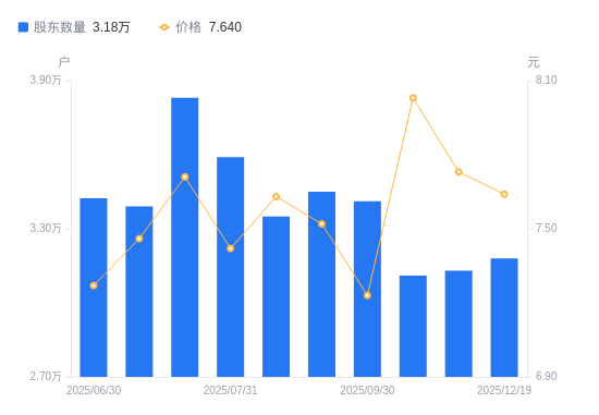 日期A股户数(户)流通A股户均持股数(股)户均持股市值(万元)2025-12-193180012588.679.622025-12-103130012789.779.892025-11-203110012872.0210.342025-09-303411911733.058.482025-09-103450011603.478.732025-08-293350011949.859.122025-07-313590011150.978.272025-07-203830010452.218.062025-07-103390011808.848.812025-06-303423011695.008.50