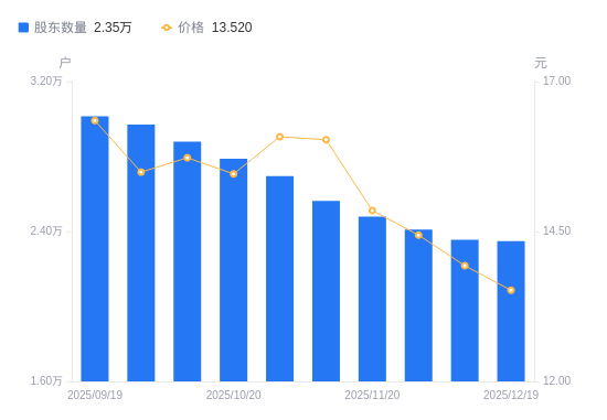 日期A股户数(户)流通A股户均持股数(股)户均持股市值(万元)2025-12-192347810267.3813.882025-12-102355410234.2514.262025-11-282410210001.5614.442025-11-20247969721.6314.442025-11-10256339404.1915.072025-10-31269508944.6214.382025-10-20278768647.5013.372025-10-10287968371.2213.172025-09-30297098113.9612.572025-09-19301537994.4813.07