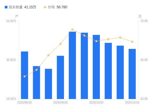 日期A股户数(户)流通A股户均持股数(股)户均持股市值(万元)2025-12-1941147817657.39100.262025-12-1042674517025.68101.352025-11-1043975816521.8796.492025-10-2047636115251.7387.162025-10-1048684414923.3290.732025-09-3049145414783.3495.632025-09-2037973419063.01105.632025-09-1031975422638.88108.872025-07-1833232721782.3884.362025-06-3039956818115.1962.48