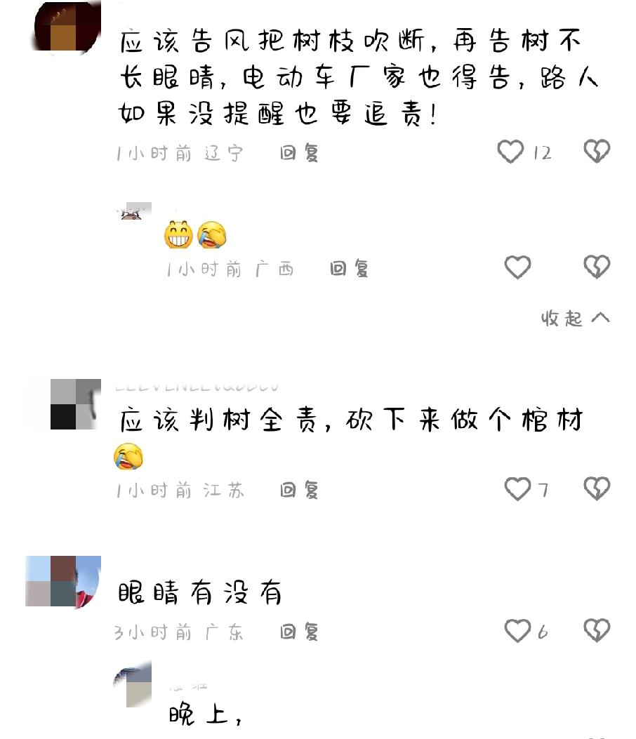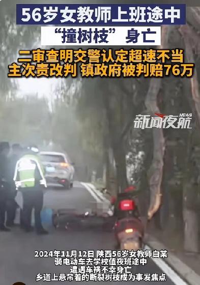 56岁女老师骑电动车上班时撞上了路边的树枝身亡!政府被判赔偿76万! 2024年11月12日,陕西兴平市56岁女教师白某骑电动车前往学校值夜班,在经过丰仪镇某乡道时,不幸撞上路面垂吊的断裂树枝,最终因伤势过重离世。最终白某承担次责,而镇政府承担主责赔付76万余元。 事故发生后,再经过一审判决后于2025年12月3日作出终审判决。二审法院查明,涉事乡道半幅宽仅3.3米,并没有明确的车道划分,另外白某的电动车车速为22.5km/h,也并没有超过电动自行车国标25km/h的上限。这起事故主要是道路隐患没有被及时排除,最终政府承担70%的责任。 案件曝光后,网友们热议不断,有网友更是神评“应该告风把树枝吹断,再告树不长眼晴,电动车厂家也得告,路人如果没提醒也要追责!” 还有网友表示“应该判树全责”由此可见大多数的人们还是觉得事故的发生与自己有很大的关系。 不管怎么说,悲剧已经发生,但是这起案件也给我们再一次敲响了安全的警钟:路边一根垂吊的树枝,看似微不足道,却因无人问津酿成了悲剧。公共安全无小事,无论是道路养护、隐患排查还是事故处理,都容不得半点敷衍。 同时,我们每个人也应该提高安全意识。在出行时,多留意周边环境,如果遇到可能存在危险的情况,如路边脱落的电线,坏了的路灯,倾斜的电线杆等都要及时反馈给相关部门。很多时候我们下意识的一次善举可能就会避免一场可怕的灾祸!