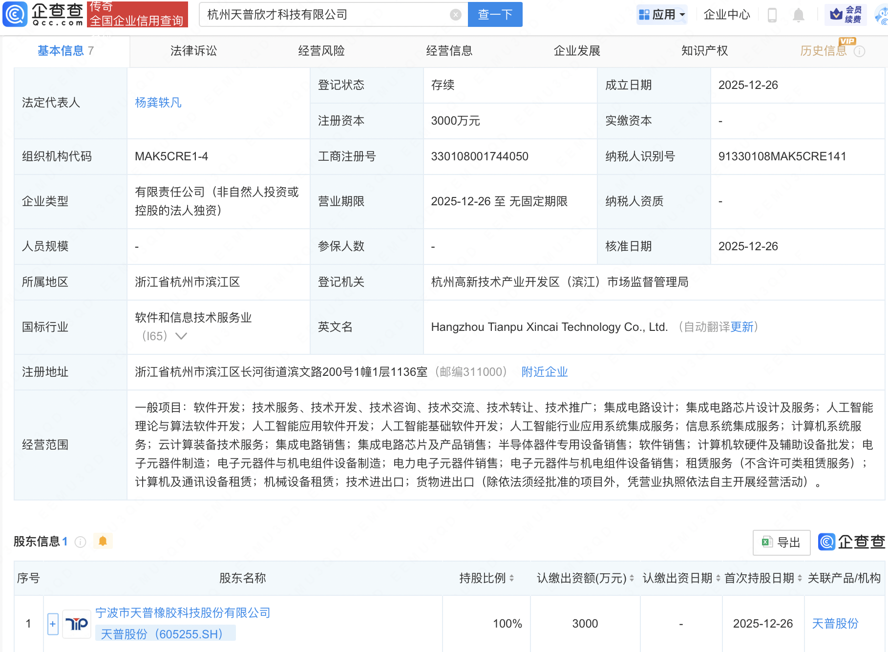 企查查APP显示,近日,杭州天普欣才科技有限公司成立,注册资本3000万元,经营范围包含:集成电路芯片设计及服务;人工智能理论与算法软件开发;人工智能应用软件开发;人工智能基础软件开发;半导体器件专用设备销售等。企查查股权穿透显示,该公司由天普股份(605255)全资持股。