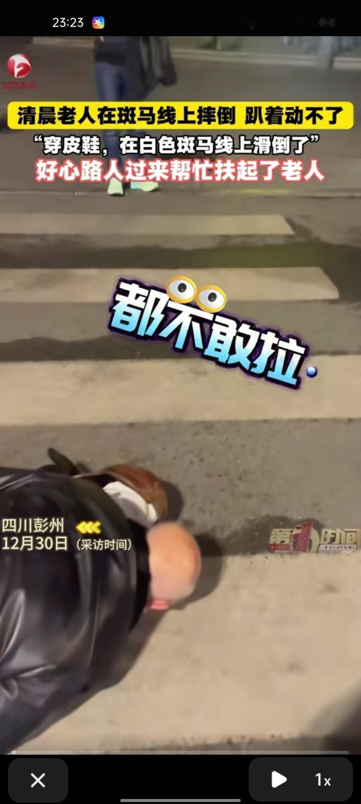 12月28日,成都彭州市。女子发视频称,当天天气较冷,早上六七点钟就有位大爷走在斑马线上突然摔倒,现在他已经趴在地上了。这时,有位好心路人过来帮忙扶起大爷,把他扶到石凳上,拍着视频的目的是因为怕遇到不讲理的老人,怎么说都说不清楚。