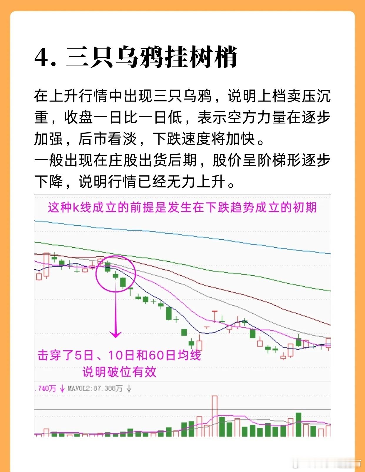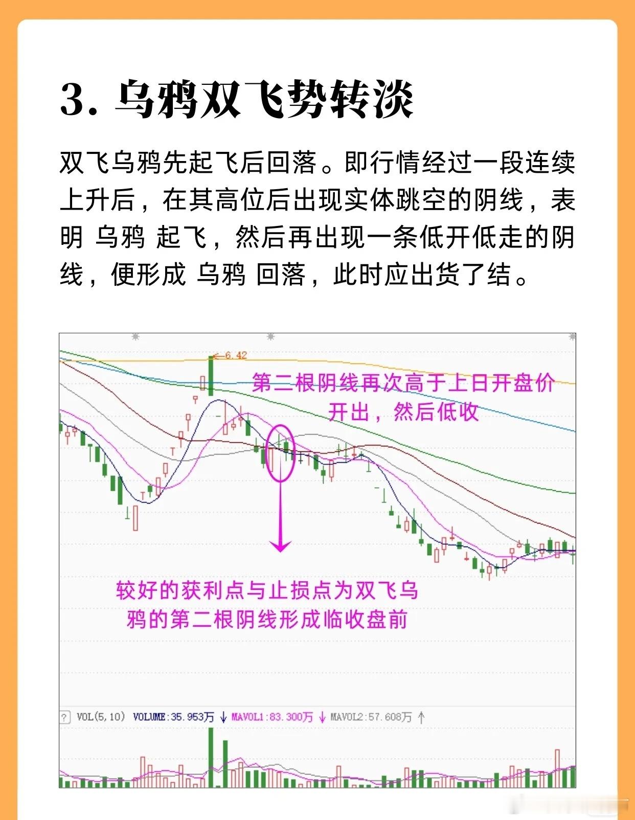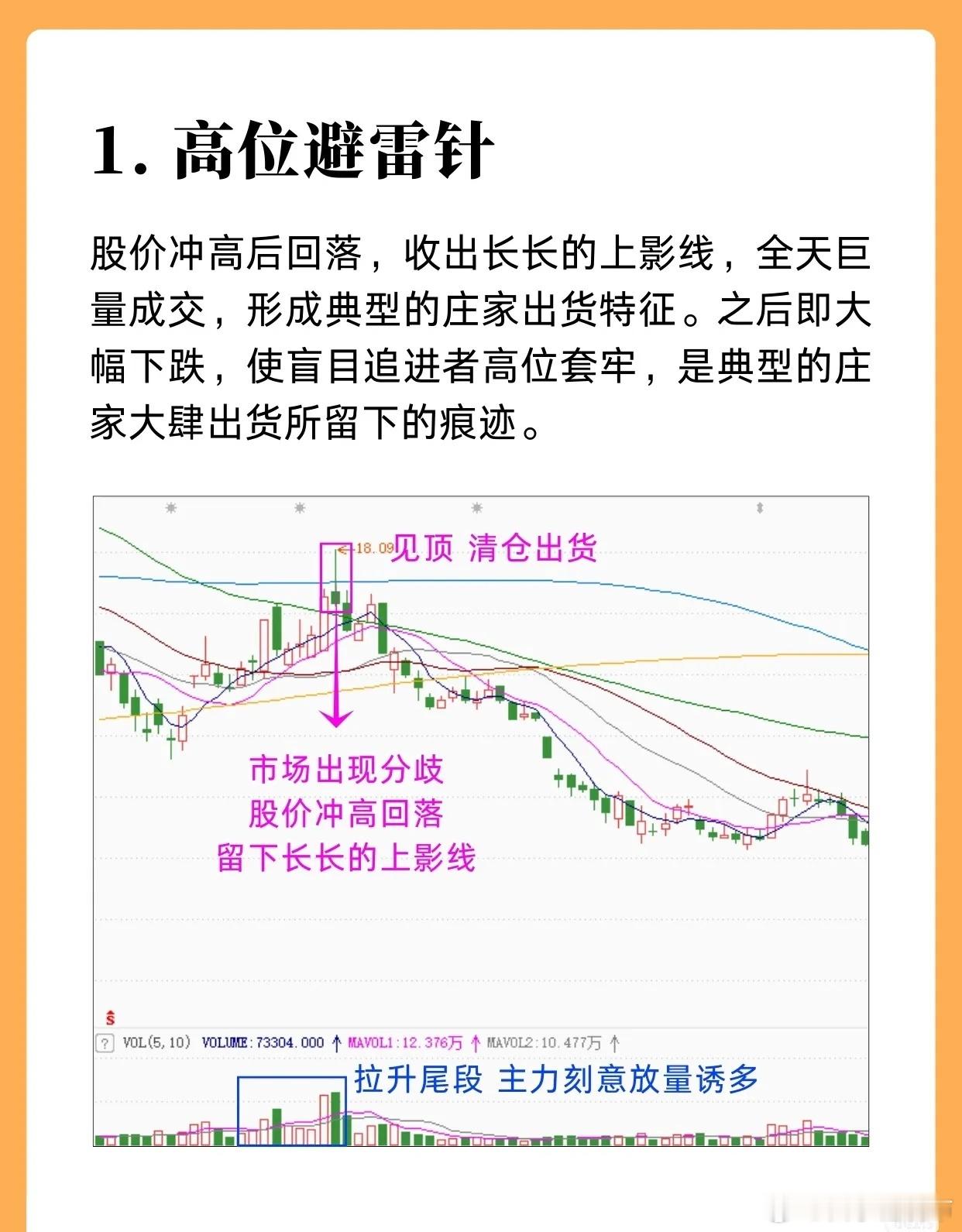 主力悄悄出货的警示及6种K线形态特征总结:1. 高位避雷针:股价冲高回落留长上影线,巨量成交,庄家出货套牢追高者;2. 倾盆大雨强转弱:低开低走阴线战胜阳线,多方转弱,短线见顶需卖出;3. 乌鸦双飞势转淡:高位先跳空阴线(起飞)再低开低走阴线(回落),应出货;4. 三只乌鸦挂树梢:上升行情中连续三日低收阴线,卖压重,庄股出货后期;5. 黄昏之星日已西:长阳后次日冲高回落留长上影、巨量高换手,庄家出货,最后卖点;6. 一阴破三线:单阴线跌破5/10/20日均线,空方强势,高位放量看跌概率高。核心是提示若股票出现上述特征,主力或正暗中抛售,股价易大幅下跌,需警惕风险。