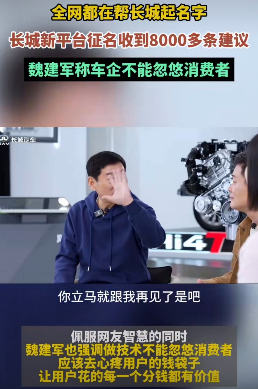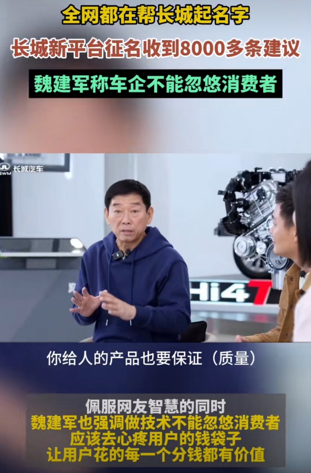 魏建军称车企不能忽悠消费者 从征集名字的热闹,到强调不忽悠消费者,感觉长城这波挺接地气的。网友的创意五花八门,而车企能把“用户的钱花得值”挂在心上,这种态度就挺拉好感的。不管最后用啥名,能真为消费者着想,才是最圈粉的~ 全网都在帮长城起名字