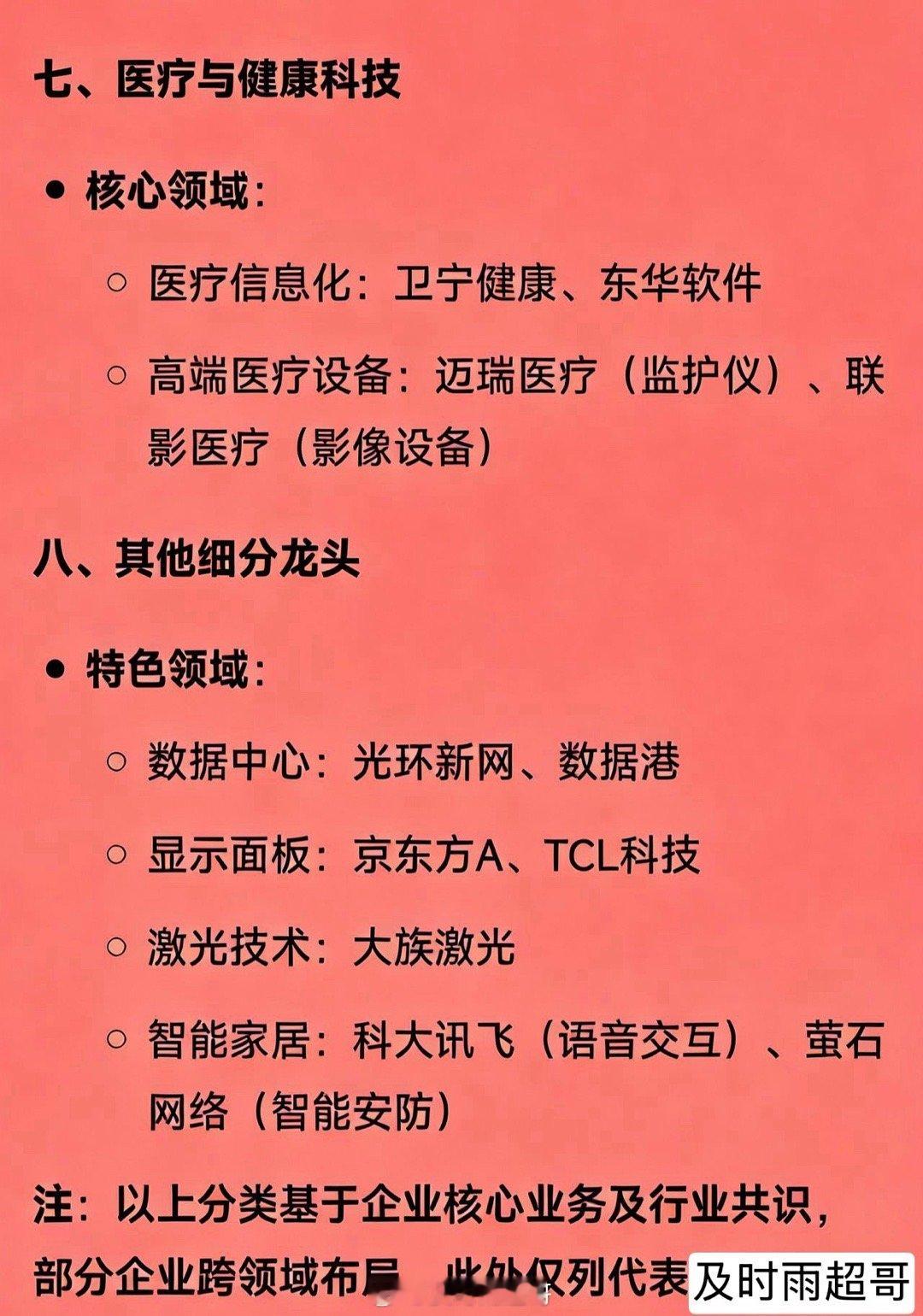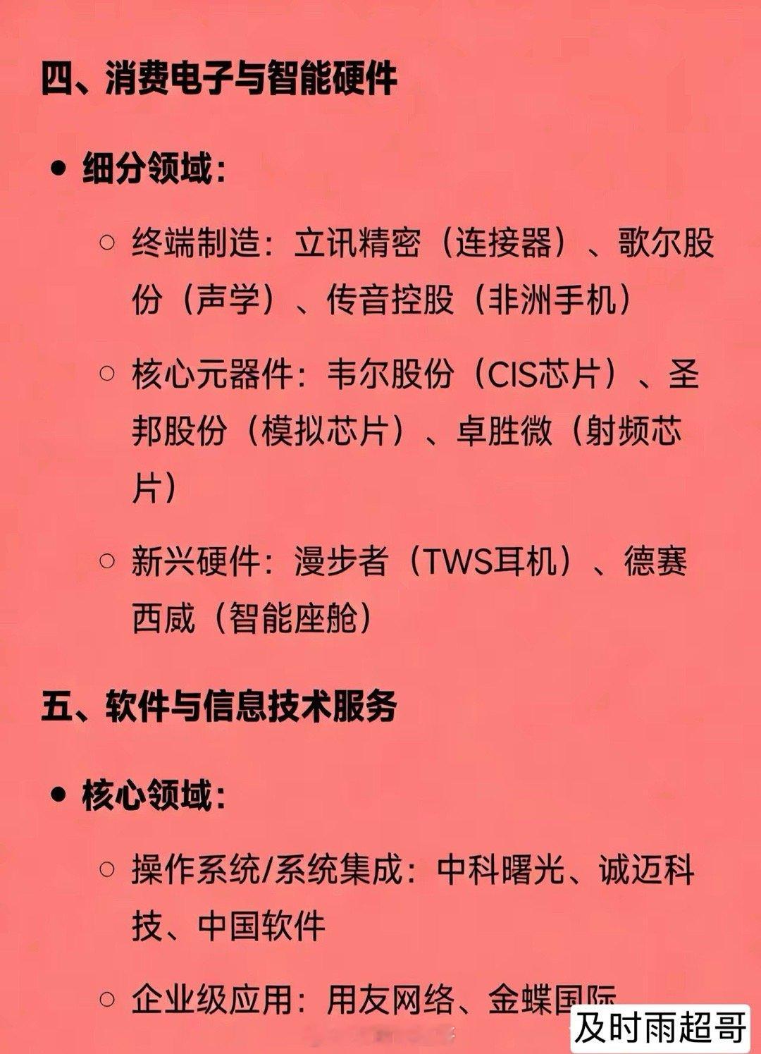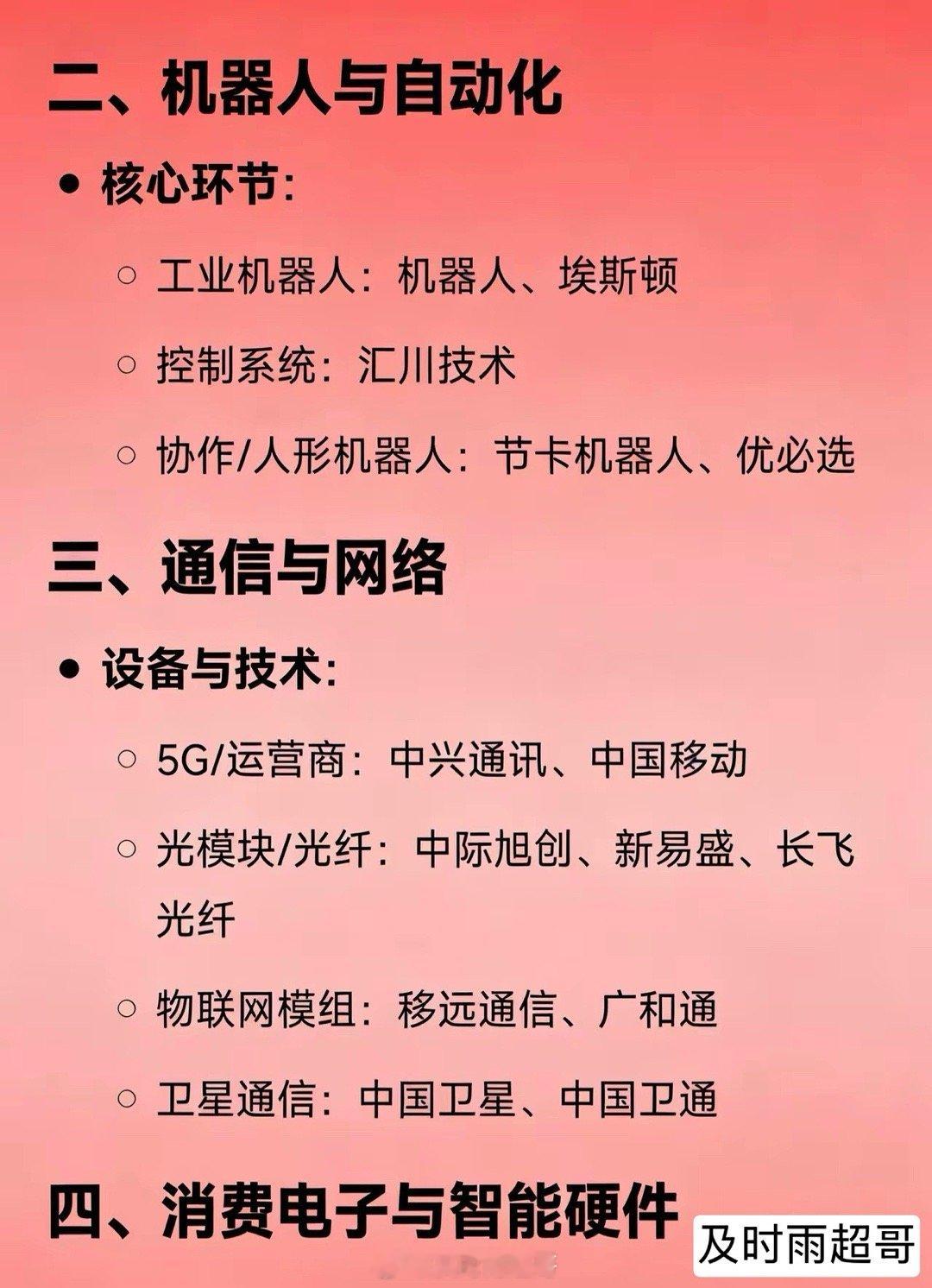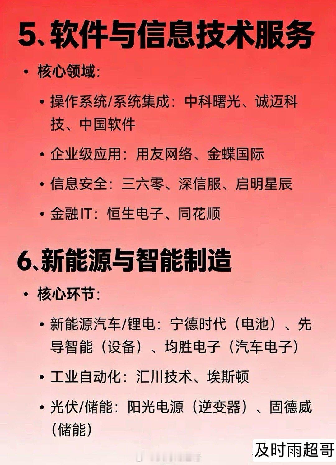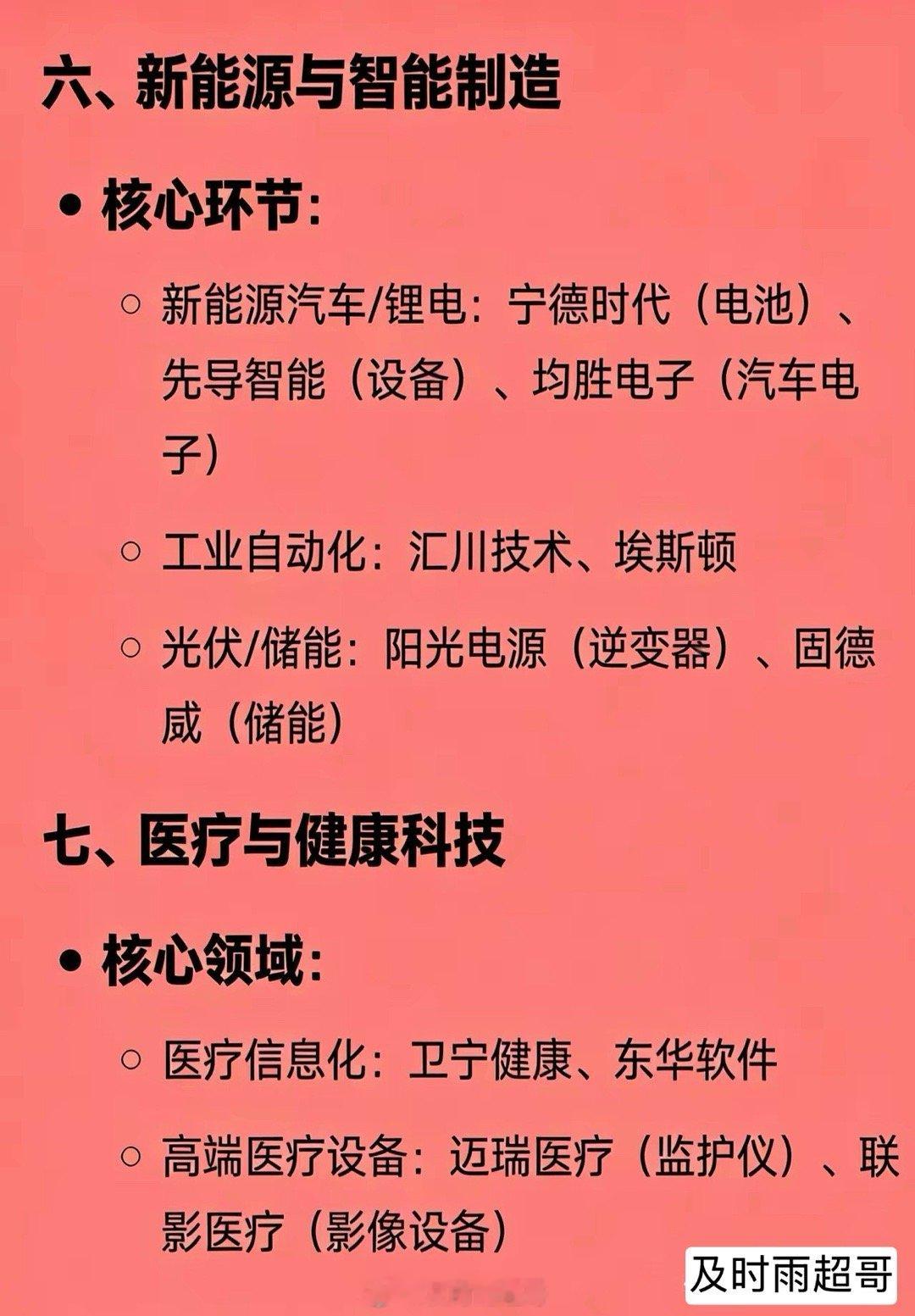 2025科技龙头100强一、半导体与集成电路全产业布局:中芯国际、长电科技、华天科技细分技术:刻蚀/晶圆制造:中微公司、晶盛机电存储/接口:兆易创新、澜起科技检测/设备:长川科技、芯源微材料:沪硅产业(硅片)、江化微(湿电子化学品)、有研新材(靶材)二、机器人与自动化核心环节:工业机器人:机器人、埃斯顿控制系统:汇川技术协作/人形机器人:节卡机器人、优必选三、通信与网络设备与技术:5G/运营商:中兴通讯、中国移动光模块/光纤:中际旭创、新易盛、长飞光纤物联网模组:移远通信、广和通卫星通信:中国卫星、中国卫通四、消费电子与智能硬件细分领域:终端制造:立讯精密(连接器)、歌尔股份(声学)、传音控股(非洲手机)核心元器件:韦尔股份(CIS芯片)、圣邦股份(模拟芯片)、卓胜微(射频芯片)新兴硬件:漫步者(TWS耳机)、德赛西威(智能座舱)五、软件与信息技术服务核心领域:操作系统/系统集成:中科曙光、诚迈科技、中国软件企业级应用:用友网络、金蝶国际信息安全:三六零、深信服、启明星辰金融IT:恒生电子、同花顺六、新能源与智能制造核心环节:新能源汽车/锂电:宁德时代(电池)、先导智能(设备)、均胜电子(汽车电子)工业自动化:汇川技术、埃斯顿光伏/储能:阳光电源(逆变器)、固德威(储能)七、医疗与健康科技核心领域:医疗信息化:卫宁健康、东华软件高端医疗设备:迈瑞医疗(监护仪)、联影医疗(影像设备)八、其他细分龙头特色领域:数据中心:光环新网、数据港显示面板:京东方A、TCL科技激光技术:大族激光智能家居:科大讯飞(语音交互)、萤石网络(智能安防)