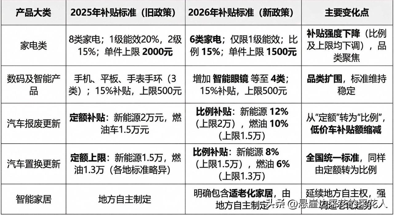 2026年国补新政正式落地,核心变化主要有这几点: 1. 汽车补贴改了规则,从固定金额变成按车价比例算。以旧换新买新能源车补8%,封顶1.5万;报废更新补12%,上限2万。金额和2025年差不多,但明年新能源车要缴购置税,买车成本其实涨了。 2. 家电补贴收紧,只覆盖冰箱、洗衣机等6类1级能效/水效产品,补售价15%,最高1500元,比去年少了2类且砍掉了2级能效。 3. 手机、平板等4类数码产品补贴标准没动,6000元以下单件最高补500元。 4. 智能眼镜首入国补,释放出“人工智能+消费”获政策力挺的信号。 5. 电梯、消防等民生设备首次纳入补贴,老旧小区加装电梯、养老和救援设备更新都能享优惠,尽显民生温度。 个人看法:这次新政精准聚焦绿色消费、智能消费和民生刚需,钱花在刀刃上,既给百姓让利,又为产业升级指明方向。首批625亿资金已到位,元旦假期正好可以去逛逛!