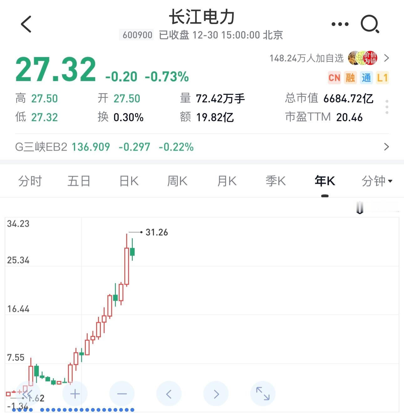 2024年7月买入长江电力持股到今天的人,通通亏钱,一年多时间,错过了牛市。但看长江电力的年线,未来还会创历史新高的。
