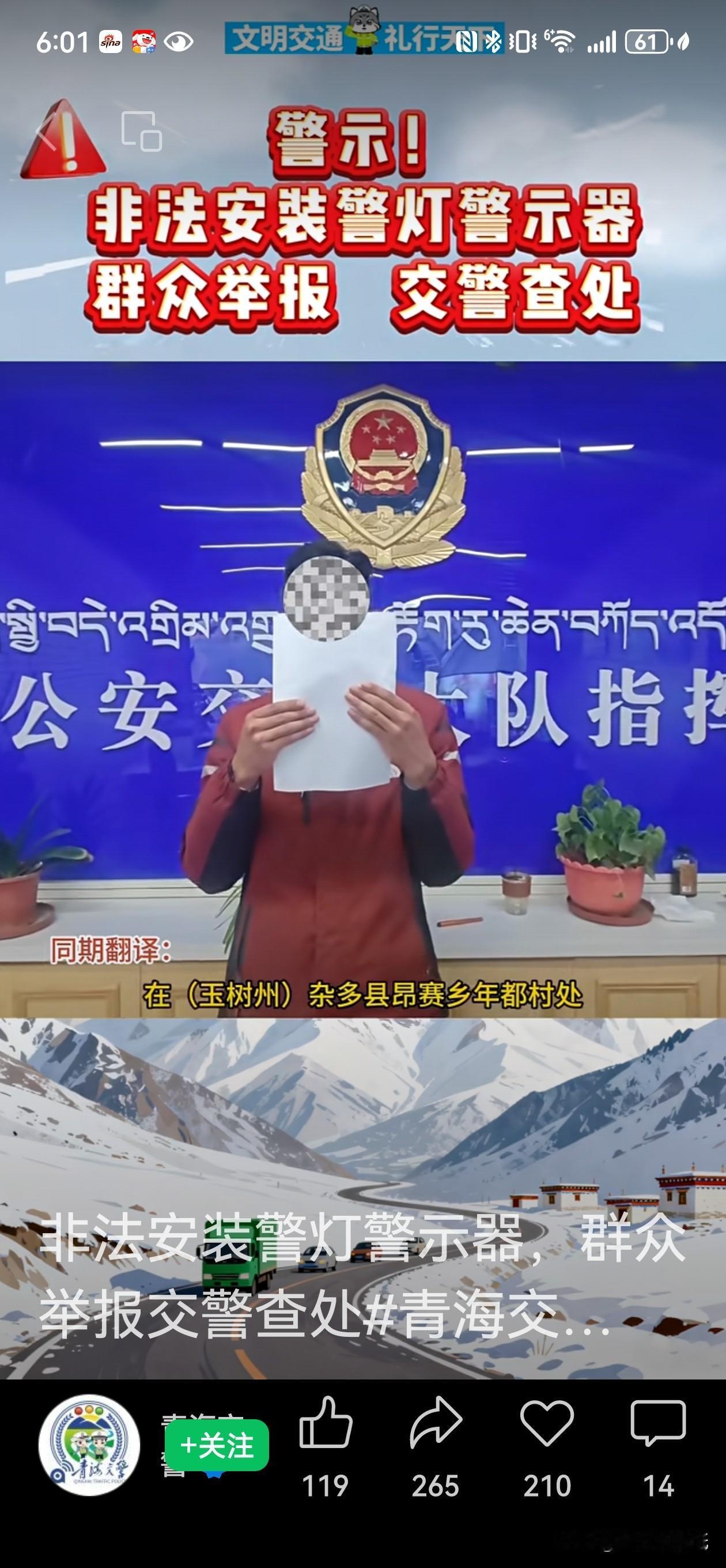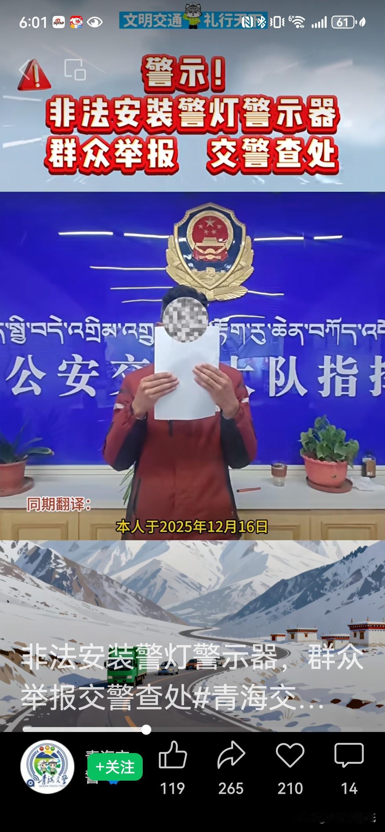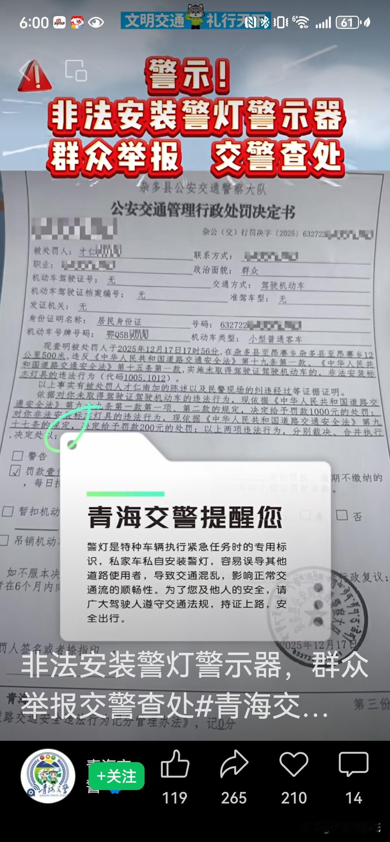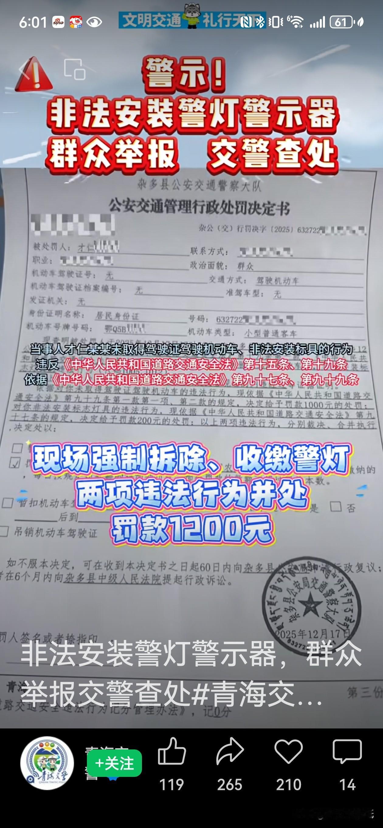 警灯不是玩具,青海这哥们胆儿真肥,也太敢玩了!没有驾照开车还敢在私家车上装警灯,这还不算,还要拍成视频发网上炫耀,这波操作真是狂得没边了! 12月16日玉树州杂多县昂赛乡年都村的这位才仁某某,硬是把违法行为玩成了“连续剧”。结果呢?群众眼睛雪亮,一个举报,民警上门:罚款1200元,警灯当场拆除收缴,真是自作自受。 警灯是警用车辆执行紧急任务时的专用标识,私家车私自安装警灯耍酷,这不是背鼓寻锤吗?道路安全不是儿戏,这种虚荣心真要不得。 老百姓在路上图个啥?不就图个平安顺畅!支持警方严格执法,也提醒那些爱搞点“新鲜花样”玩的司机:规矩就是规矩,千万不能逾越。安全驾驶,从守好底线开始!