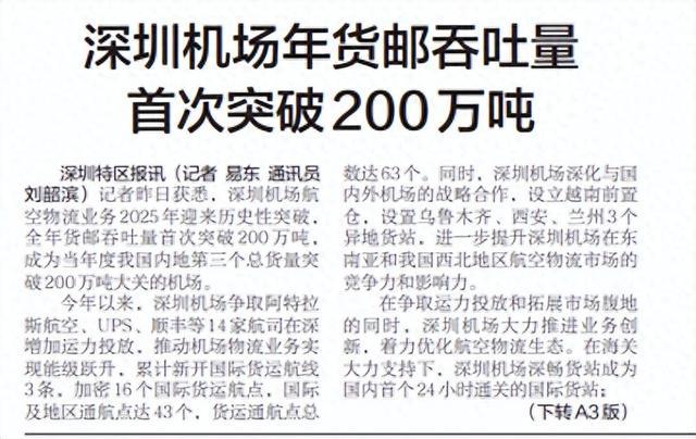 [深圳特区报]深圳机场年货邮吞吐量首次突破200万吨