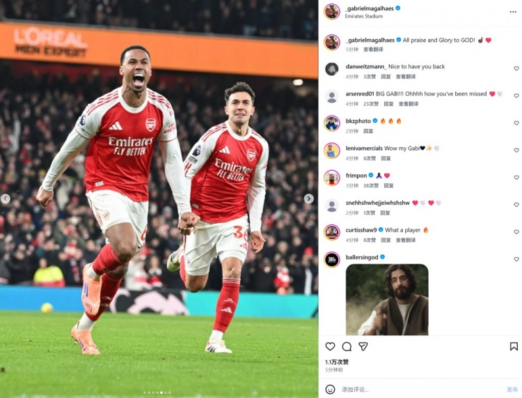 本场比赛加布里埃尔破门先拔头筹,赛后当选英超官方全场最佳。他也在个人社媒晒出本场庆祝照片,配文写道:“所有赞美和荣耀归于上帝!”