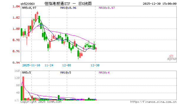 12月30日,恒指港股通ETF(520960)涨0.31%,成交额360.73万元。当日份额减少400.00万份,最新份额为1.50亿份,近20个交易日份额减少4100.00万份。最新资产净值计算值为1.46亿元。