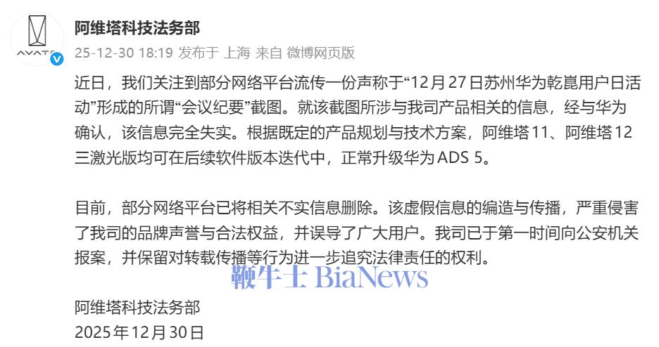 近日,阿维塔关注到部分网络平台流传一份声称于“12月27日苏州华为乾崑用户日活动”形成的所谓“会议纪要”截图。就该截图所涉与我司产品相关的信息,经与华为确认,该信息完全失实。