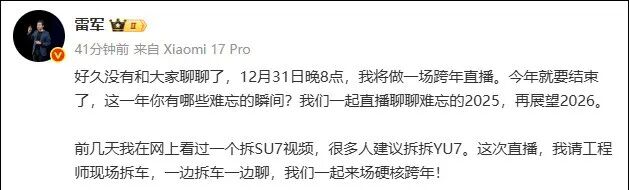 12月30日,小米创办人、董事长兼CEO雷军曾宣布,将于12月31日晚8点做一场跨年拆车直播。