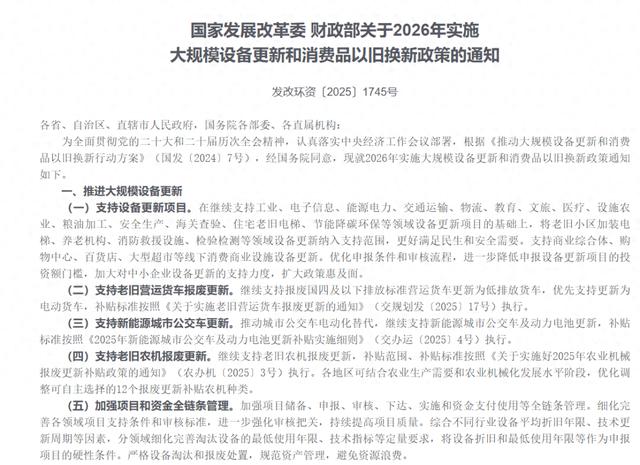 国家发展改革委、财政部印发的《关于2026年实施大规模设备更新和消费品以旧换新政策的通知》30日对外发布,明确2026年“两新”政策的支持范围、补贴标准和工作要求。