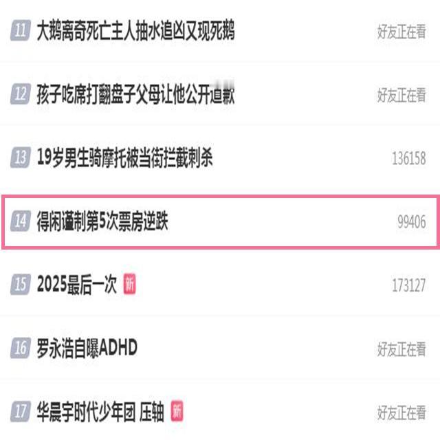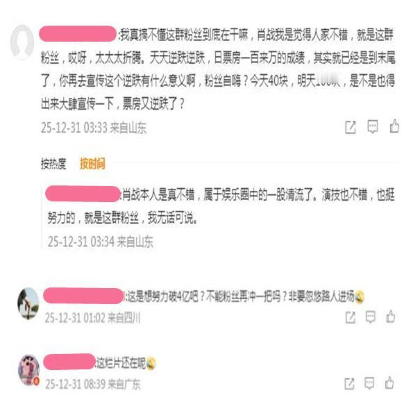 得闲谨制第五次票房逆跌上热搜,网友终于忍不住吐槽了 作为正午阳光首部院线电影,《得闲谨制》的配置堪称豪华:孔笙导演 + 兰晓龙编剧的黄金组合,再加上顶流肖战扛旗主演,上映前就靠着 “刷脸进场防黄牛” 的首映礼操作赚足话题。 影片以石牌保卫战为背景,讲述钳工莫得闲带领村民用民间智慧抗日的故事,走的是 “小人物觉醒” 的黑色幽默路线,实景搭建的戈止镇和细腻的镜头语言,确实能看出制作诚意。截至目前,影片票房定格在 3.78 亿,稳坐贺岁档国产片头把交椅,但比起肖战年初《射雕英雄传:侠之大者》6.89 亿的成绩,涨幅明显后劲不足。 不过票房涨势平平,宣传却堪称 “内卷天花板”。从12月13日实现首次逆跌,就开启了另类赛道,上映 26 天,五次靠 “票房逆跌” 登上热搜榜,连篇累牍的热搜轰炸让路人观众逐渐审美疲劳。 第五次逆跌热搜上线当天,网友的吐槽彻底炸了锅。“逆跌到底跌了多少啊?不会涨 40 块、100 块就来占热搜位吧?”更有犀利网友直指核心:“想冲4亿票房直接让粉丝包场啊,天天拿‘逆跌’忽悠路人进场,算怎么回事?” 不知道在一片吐槽声中,得闲谨制第六次票房逆跌,还能上热搜吗?