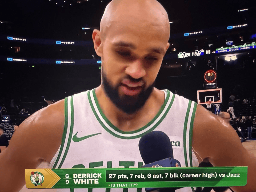 全场比赛,凯尔特人后卫德里克-怀特首发出战36分钟,16投8中,三分球10投2中,罚球9罚9中得到27分7篮板6助攻7封盖。