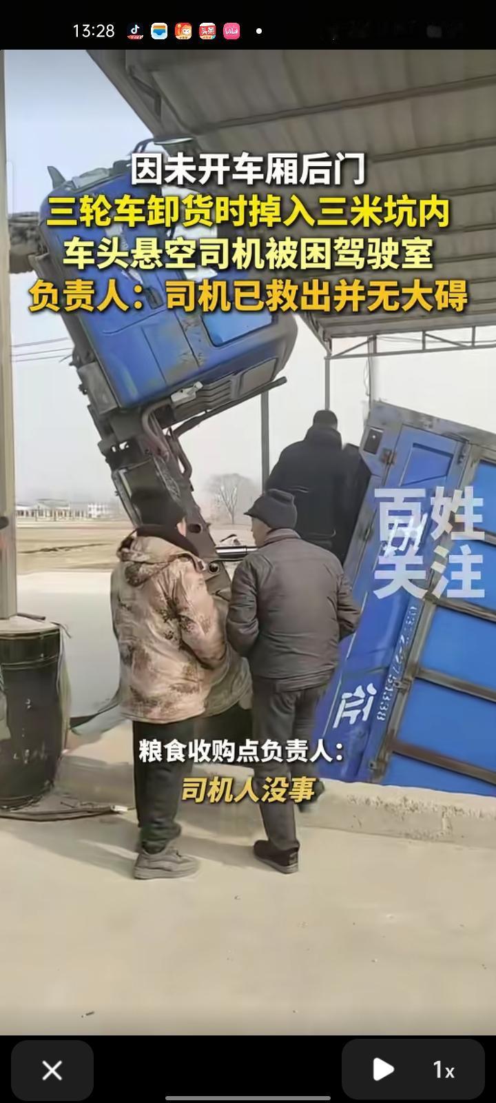 12月30日,邯郸市临漳县。一辆载玉米的三轮车卸货时因后门未开,直接升起车厢,导致车头悬空,司机被困驾驶室。随后,收购点负责人铲车将其救出,人无大碍。负责人称,事发时有人提醒,但机器声音太大,司机没听到。