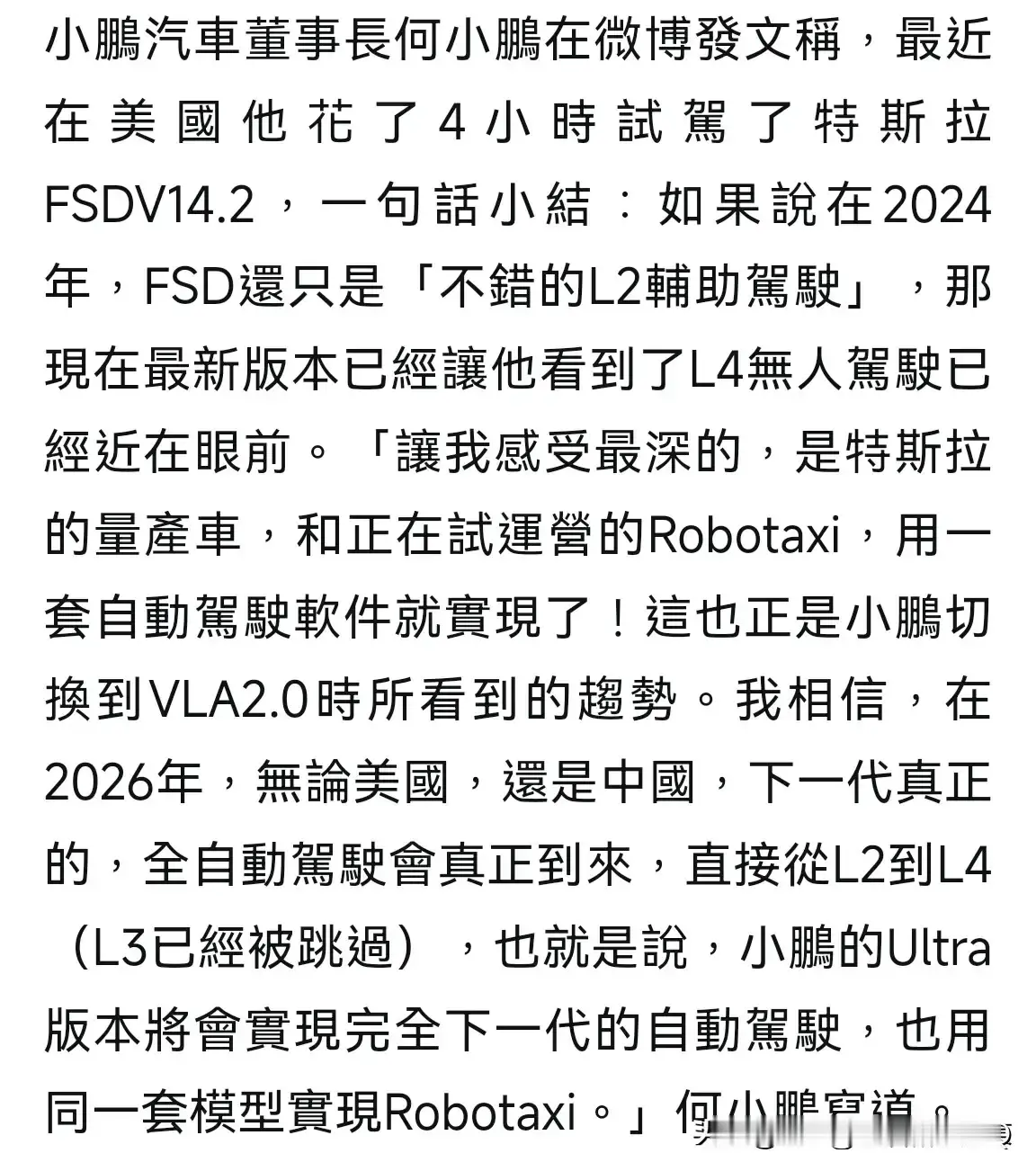 何小鹏约战马斯克 你看好谁!小鹏汽车和特斯拉鄙视L3,都有能力跳过它,明年直接全自动驾驶,为此何小鹏试驾特斯拉FSD V14.2后判断,全球就他们敢认第一第二,没有那间车厂认第三,完全不把比亚迪和华为放在眼里,其实消费者买不买账,好像自己说了算,马斯克不作回应,因为他知道在中国技术日新月异,强中自有强中手,能人背后有能人。新能源汽车行业竞争很大很快!