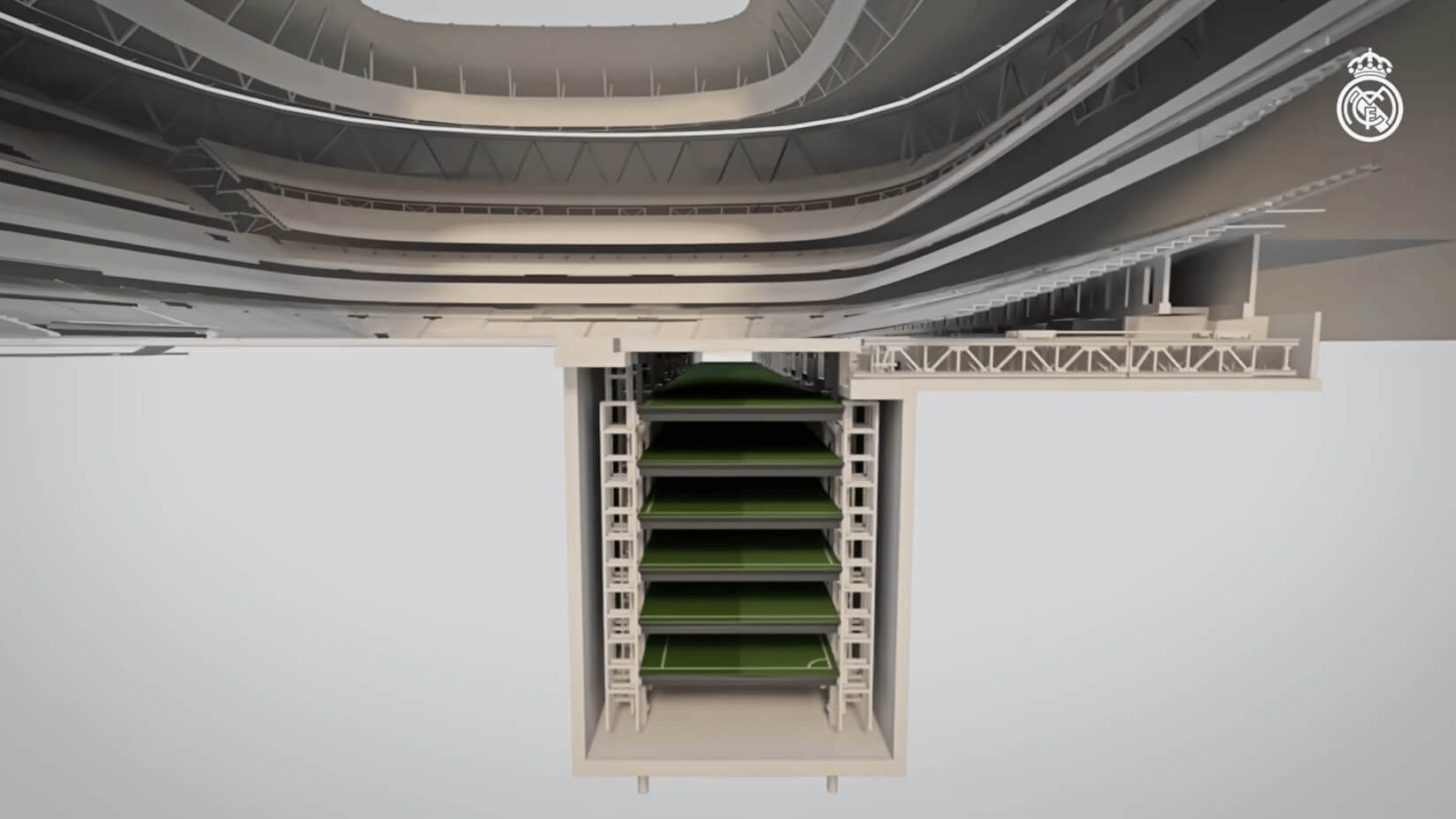 球场被分为六个部分,宽11.67米,长107米。当需要更换球场草坪时,一项精妙的工程设计使得这些草坪可以巧妙地折叠收纳到地下深处。这使皇家马德里的官方能够快速高效地更换球场草坪,或者将其替换为其他类型的草坪。